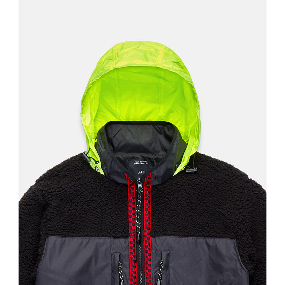 Sherpa fleece jacket assembled with nylon overlay accents. Features red jacquard taping over zipper closure and hideaway lime green hoodie. Two snap pockets and screen printed branding.