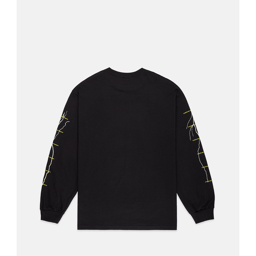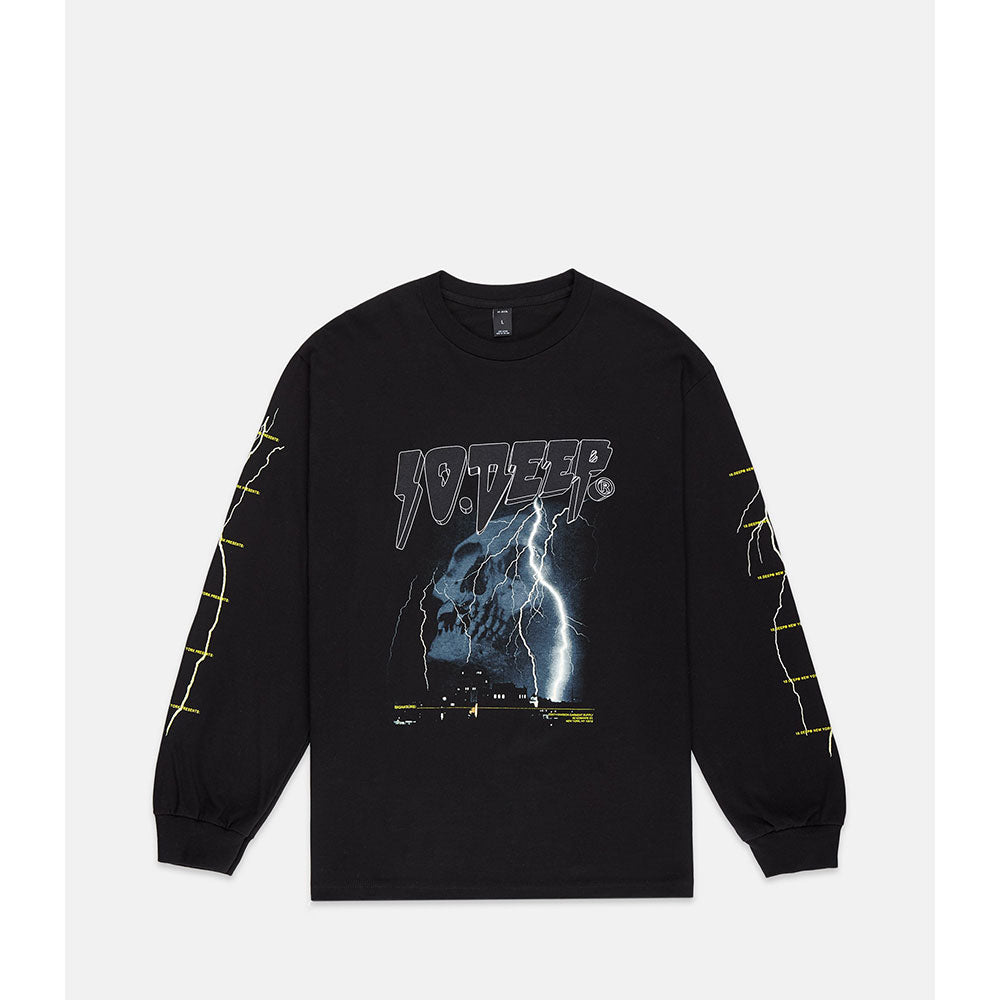 Screen printed graphic of a cityscape skyline underneath an skull and lightning strikes. The imagined utopia of a perfect society masked by darkness and totalitarian control. Custom screen print on the chest and lightning strikes down the arms.