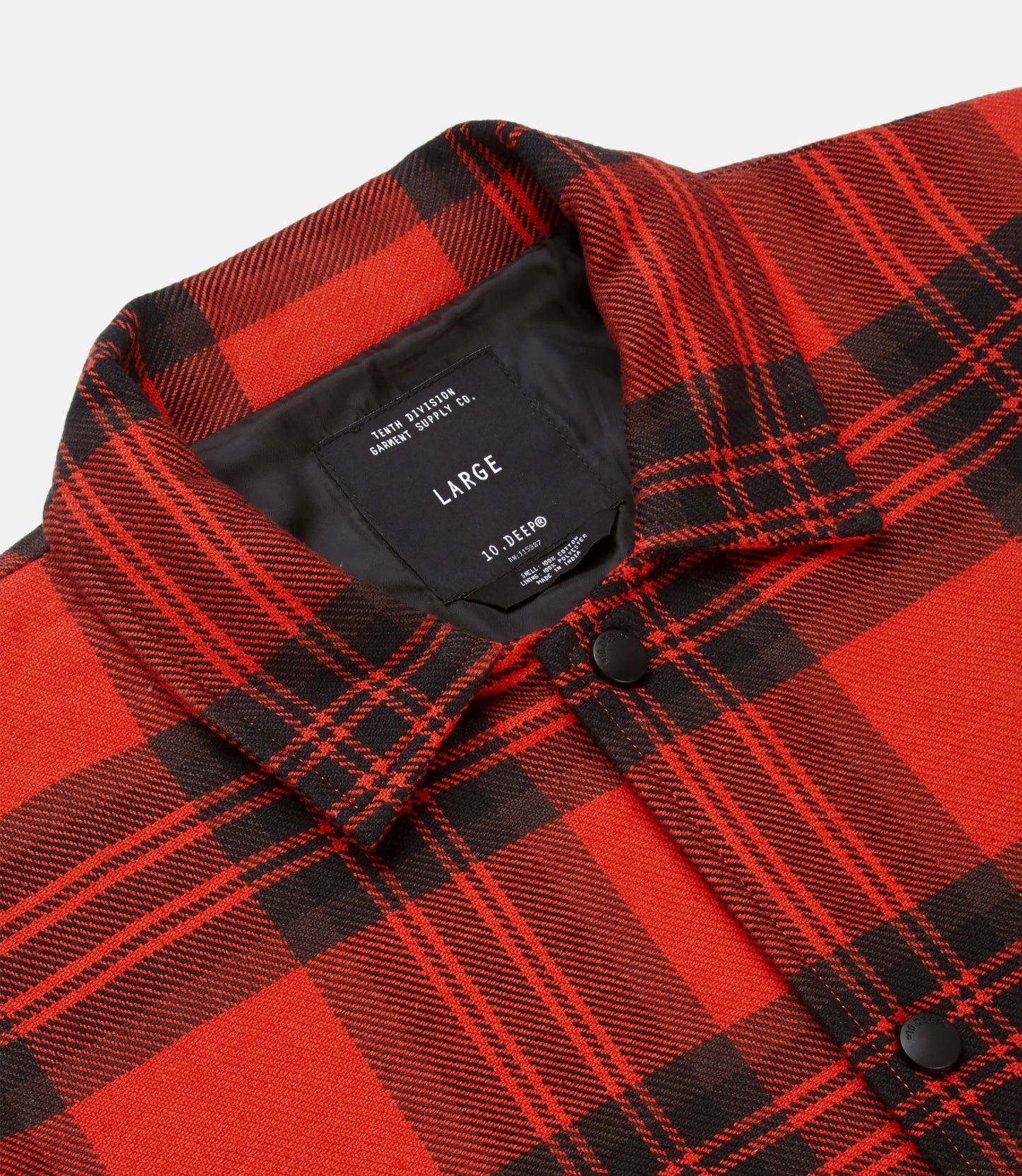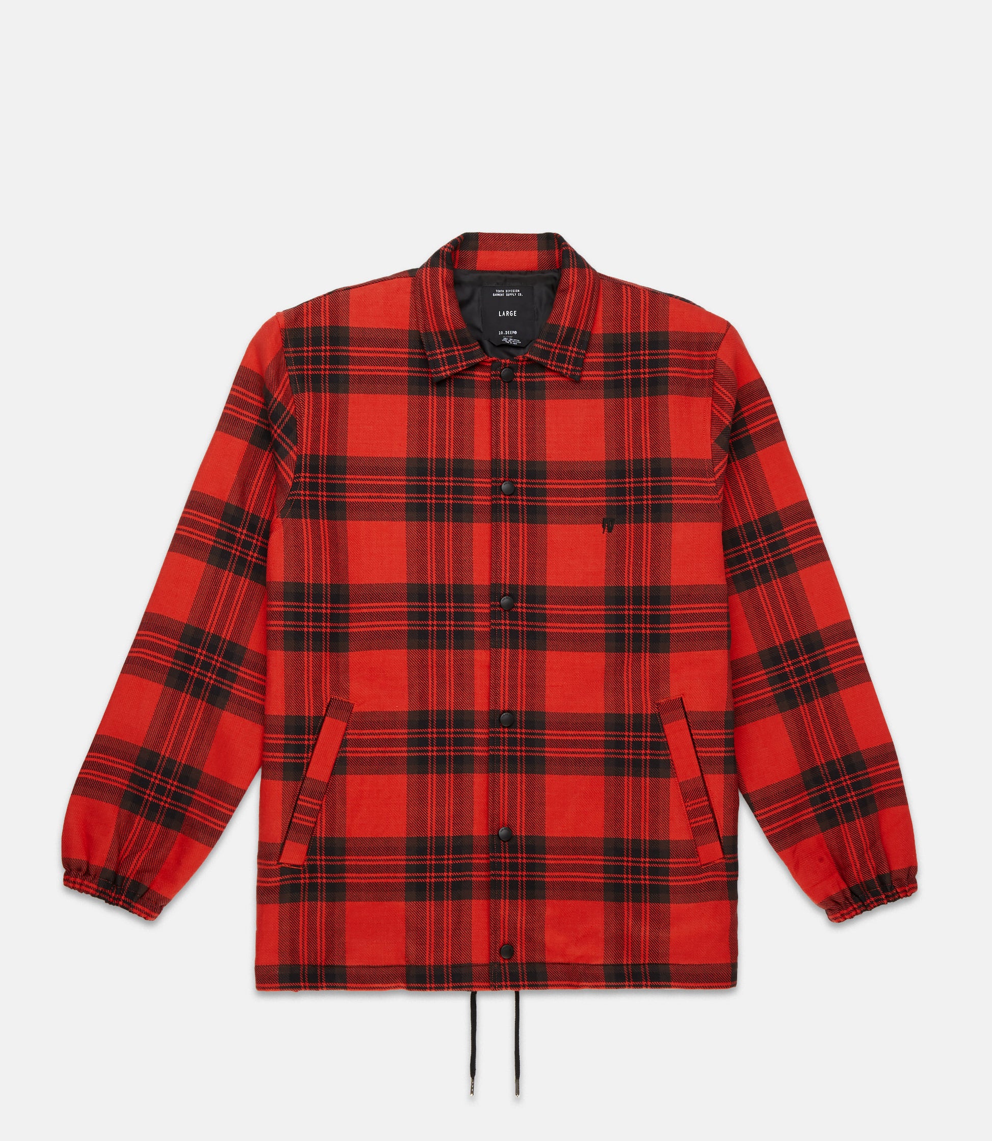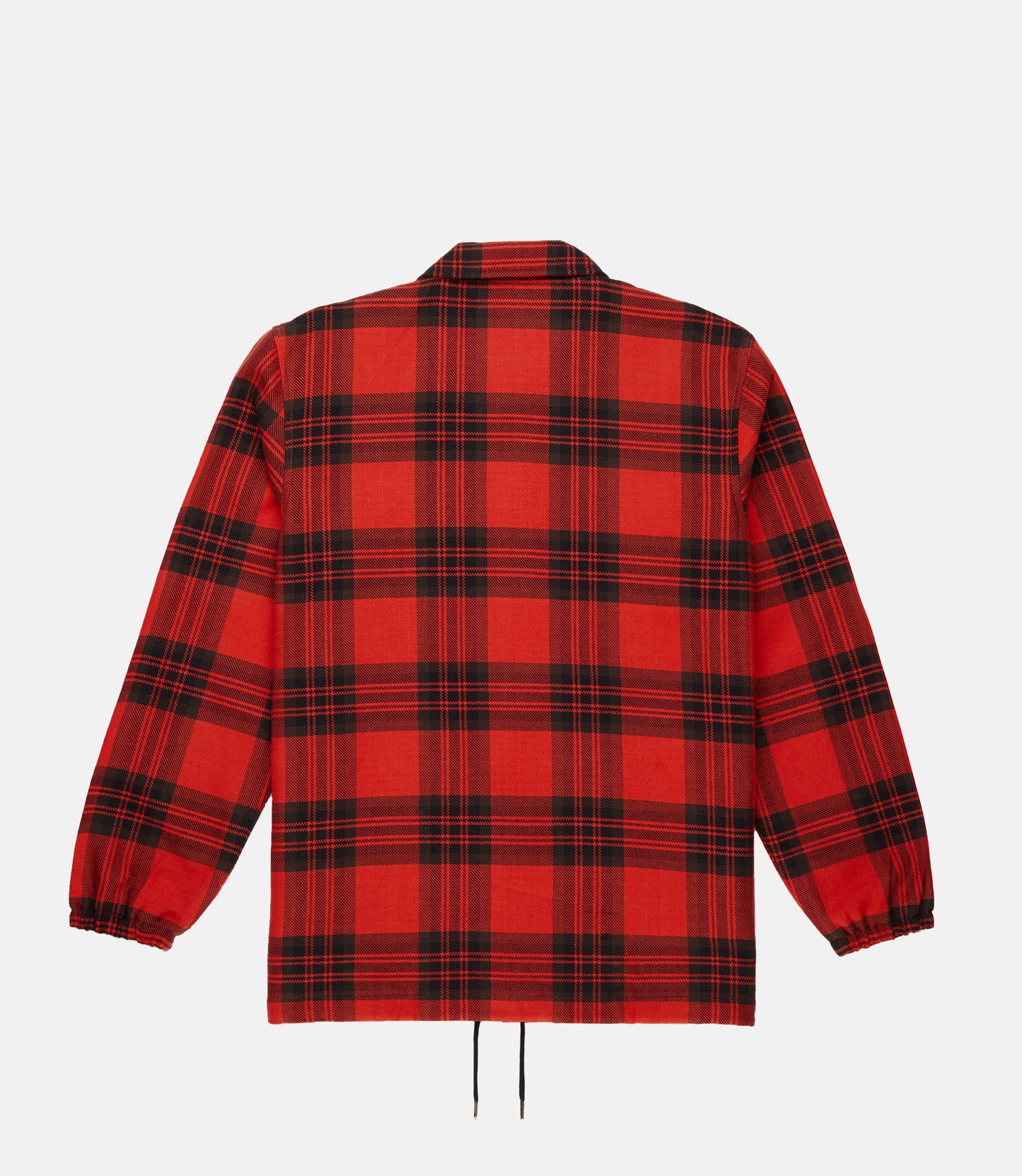Heavyweight cotton flannel plaid coach's jacket. Custom milled fabric in eye catching red. Feature snap front closure, welt pockets, and custom logo embroidery on the left chest.