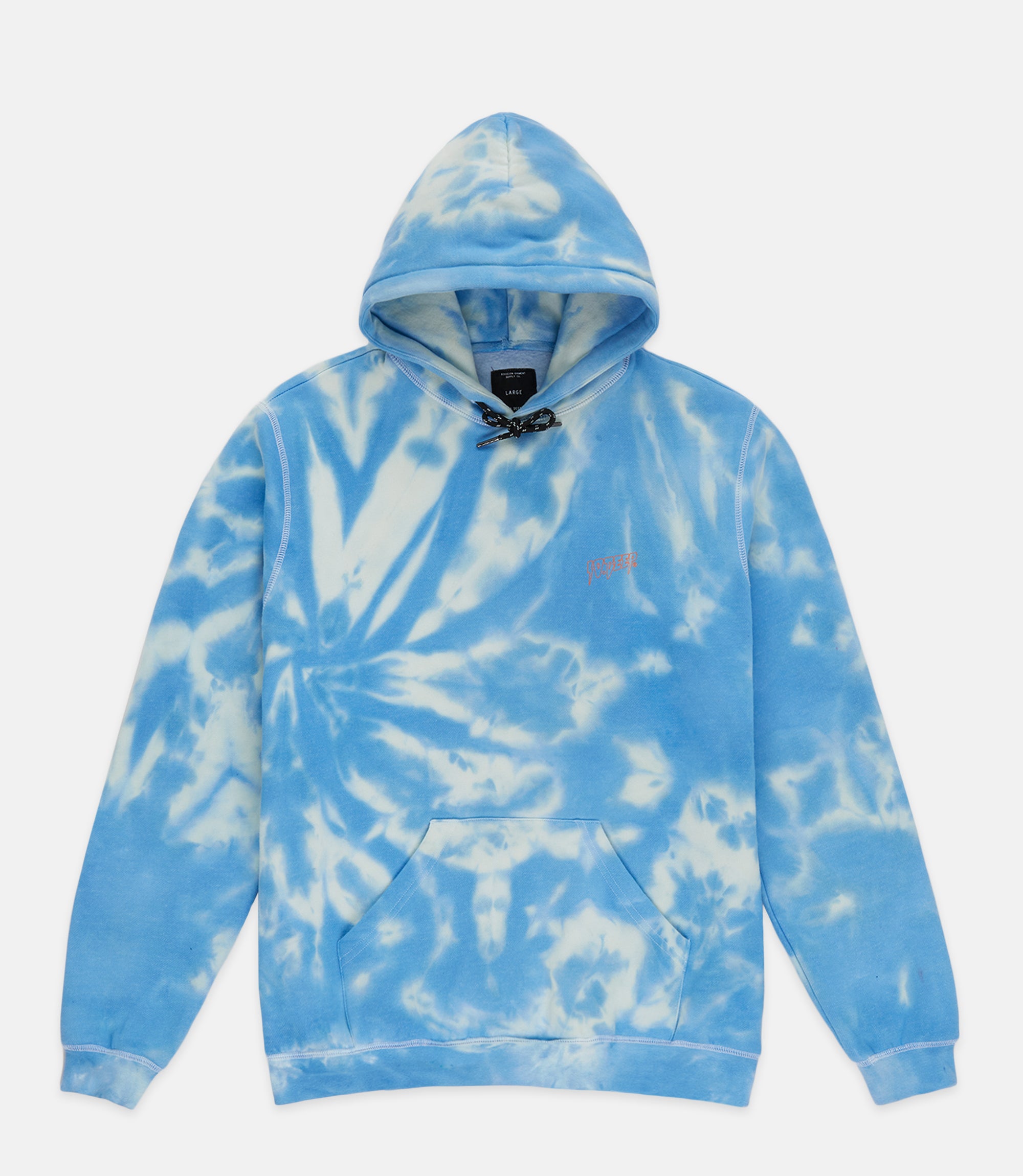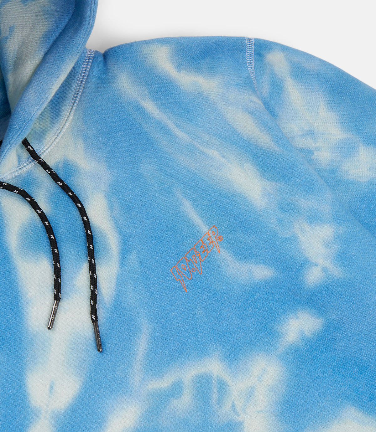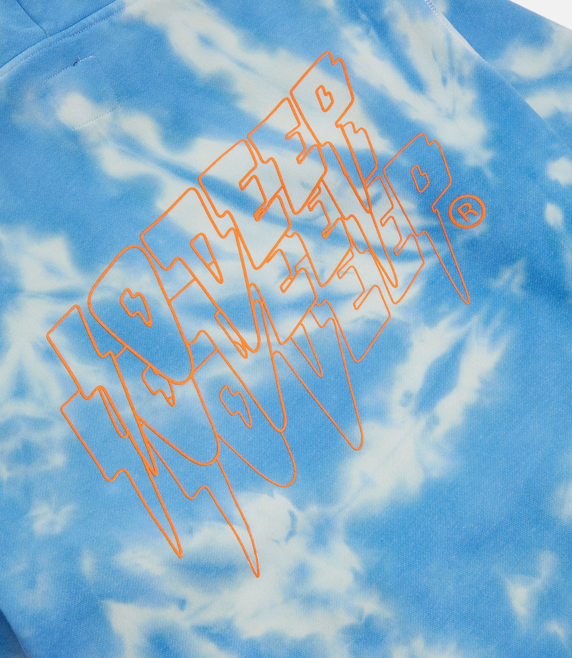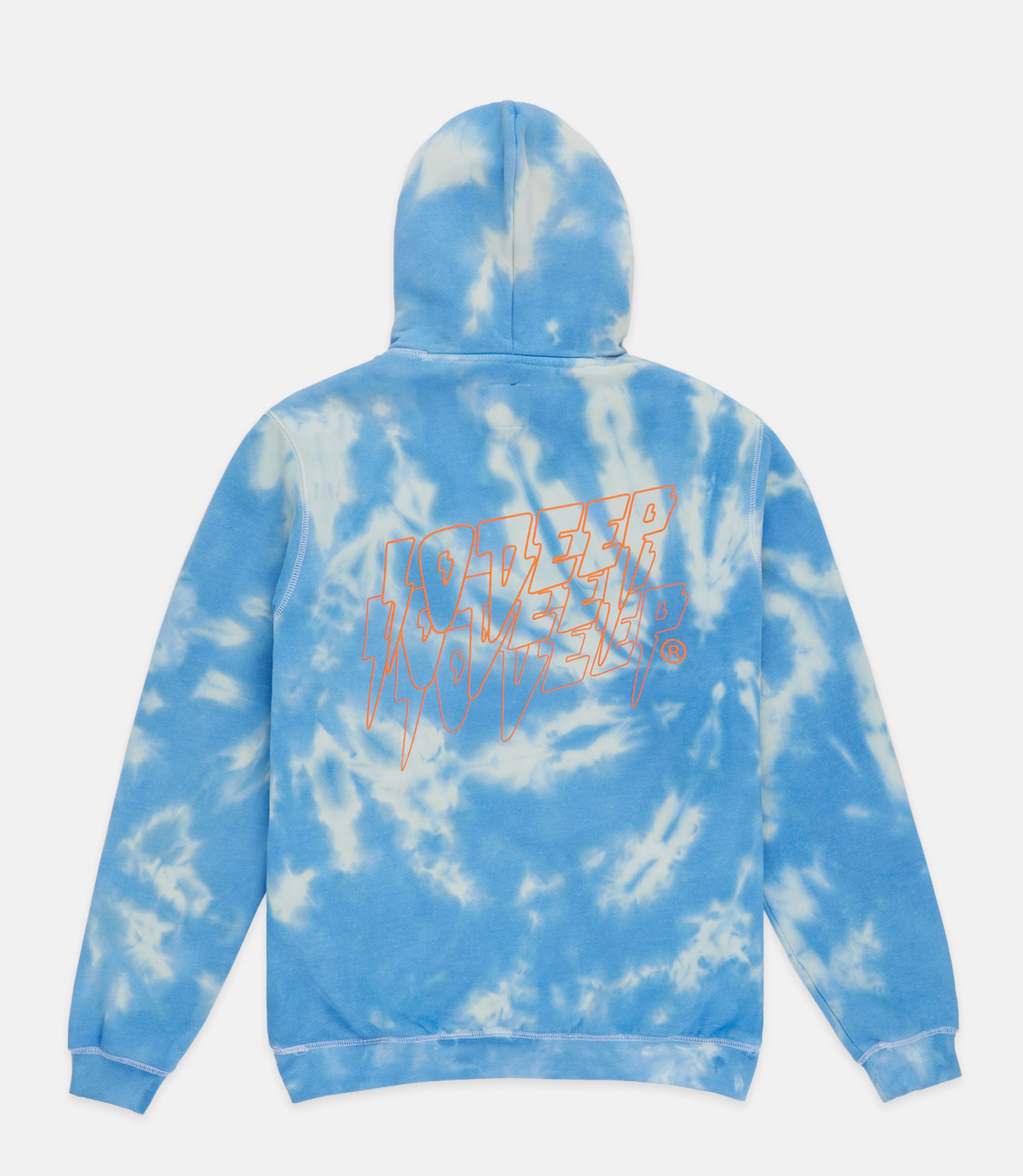Custom fleece hoodie in all over blue tie dye. Signature Sound & Fury graphic in orange on the left chest and across the back. Features adjustable hood and waist with kangaroo pocket.
