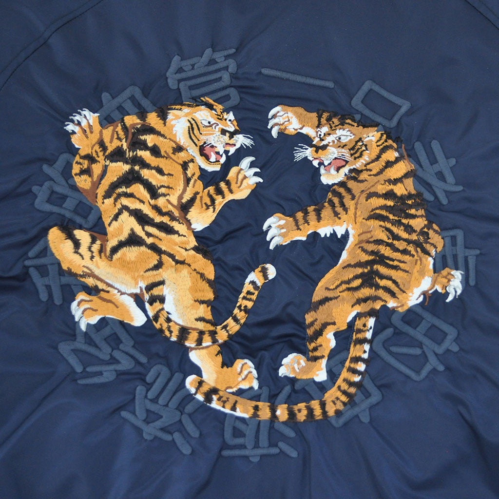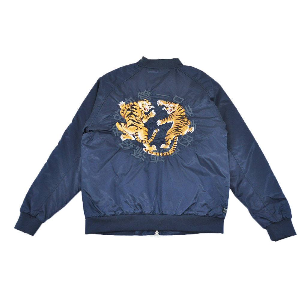 Nylon crew jacket with light polyfill for extra warmth. Features two-way zipper, welt pockets, and custom tiger embroidery on the back.
