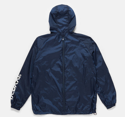 Lightweight zip front ripstop nylon jacket with two way zippered pockets. Bungee cord neck pulls, screen printed left sleeve, and zipper down center of back.