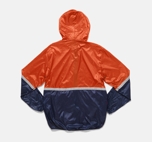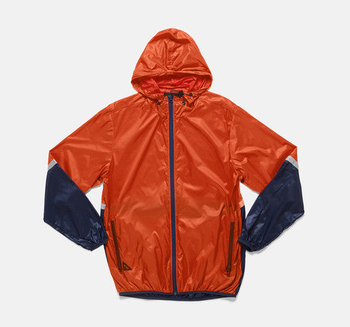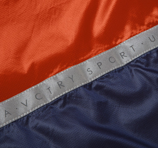 Featherweight zip front color blocked jacket. Bungee cord pulls at neck and two zip side pockets. Reflective stretch tape with VCTRY branding around arms and back of jacket.