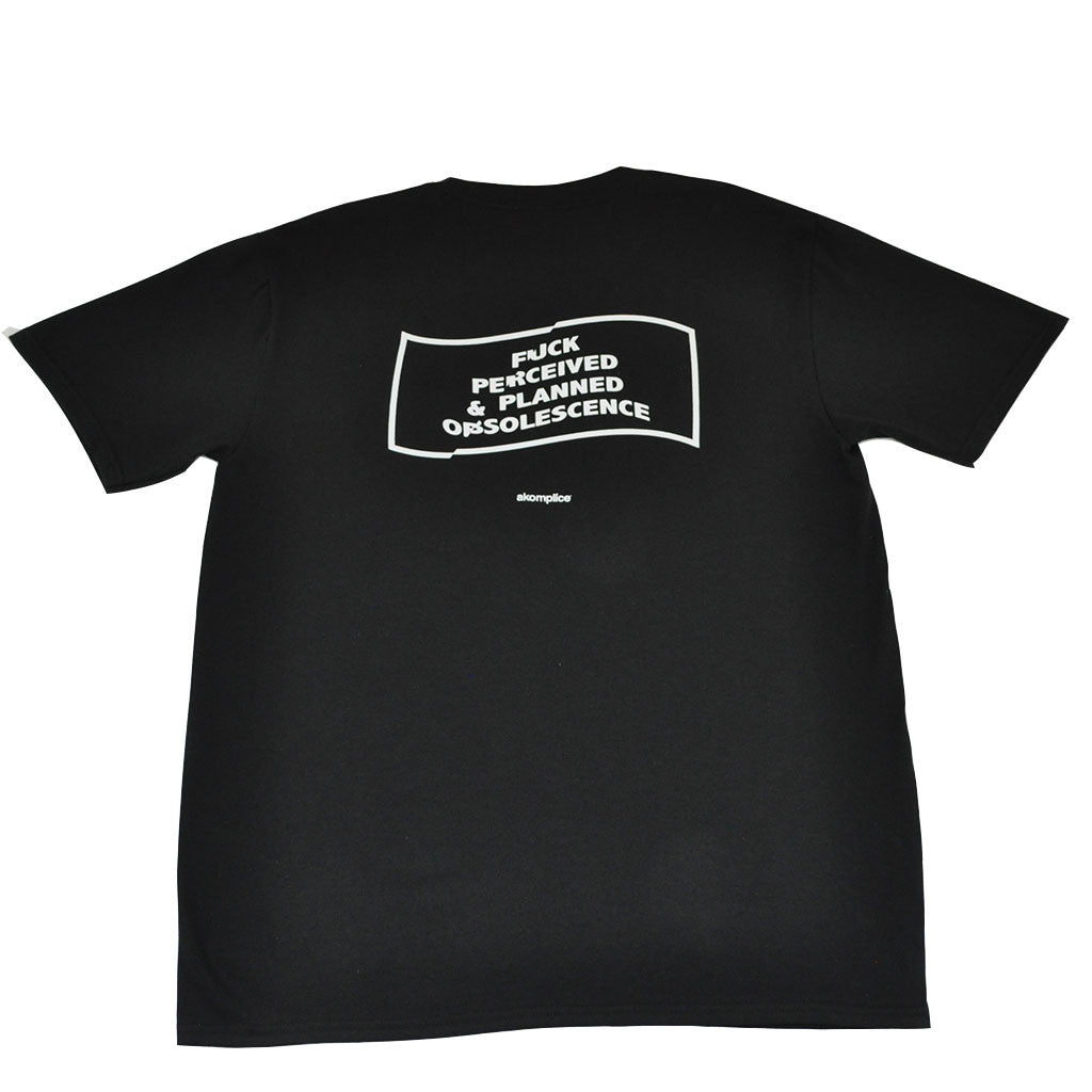 Features "Buyless" screen print on front and "Fuck, Perceived, & Planned Obsolescence" on the back.