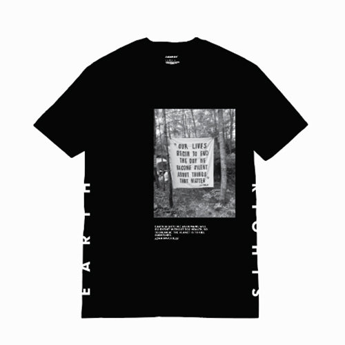 Features screen printed black and white photograph on the chest and "Earth Rights" on the sides of the shirt.