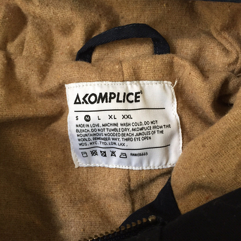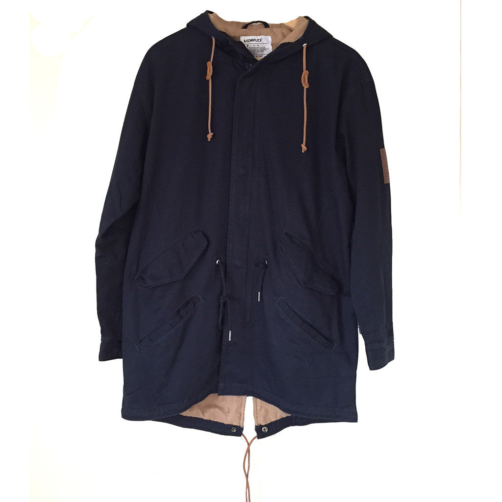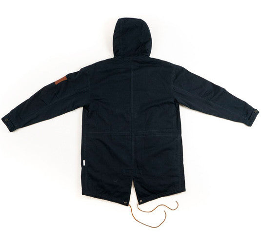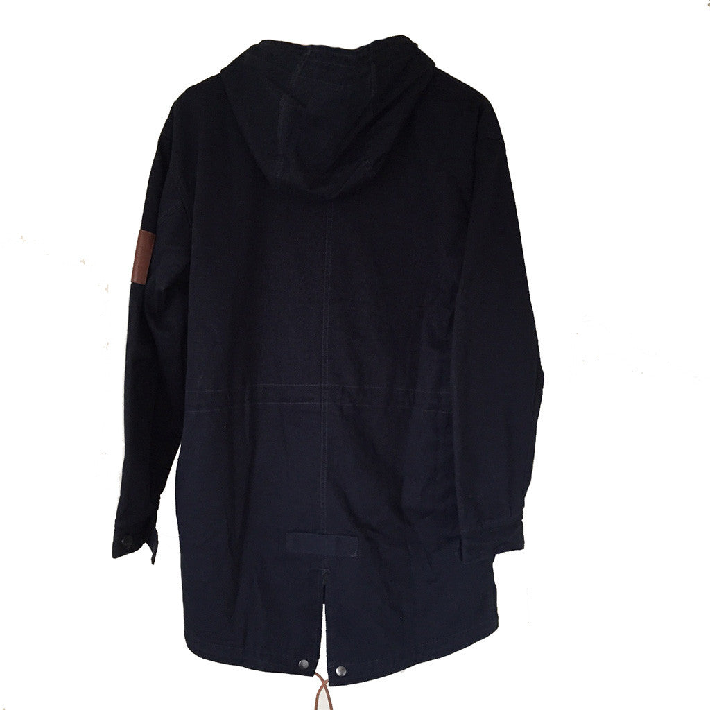 Cotton trench jacket with elongated fishtail back and flannel lining. Features hidden zipper with snap closures, two snap front pockets, and two slit front pockets. Leather drawcord stoppers at hood and bottom hem. Adjustable braided drawcord at waist and custom branded batch on left arm.