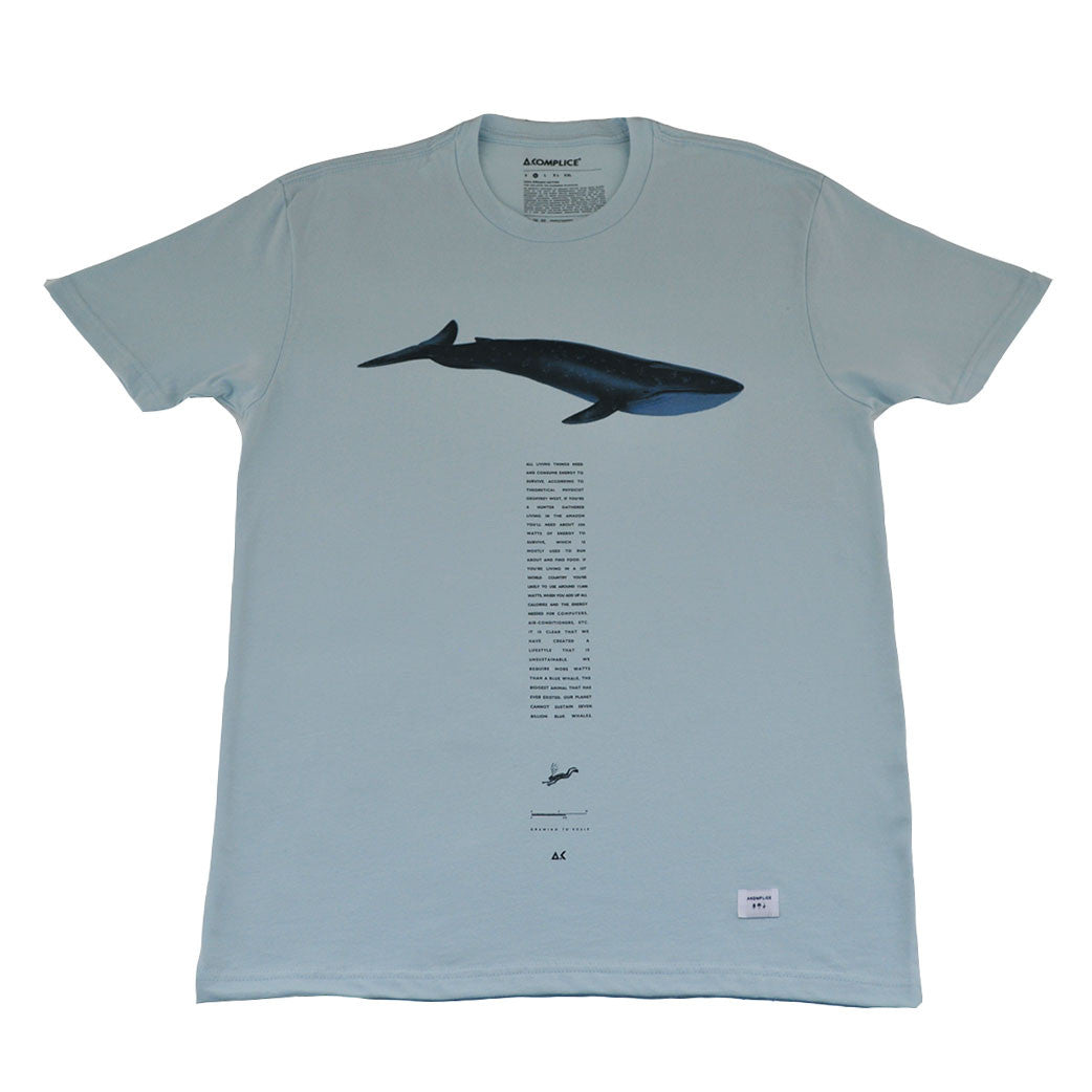 Features custom screen print of a blue whale with a statement of conservation and sustainability.