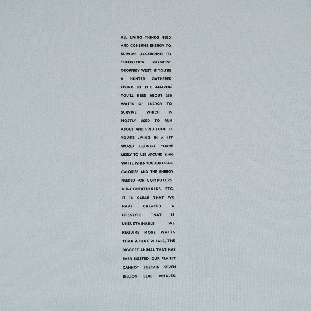 Text says, "All living things need and consume energy to survive. According to theoretical physicist Geoffrey West, if you're a hunter gatherer living in the Amazon, you'll need about 256 watts of energy to survive, which is mostly used to run about and find food. If you're living in a first world country you're likely to use around 11,000 watts when you add up all the calories and the energy needed for computers, air conditioners, etc. It is clear that we have created a lifestyle that is unsustainable. We require more watts than a blue whale, the biggest animal that has ever existed. Our planet cannot sustain seven billion blue whales."