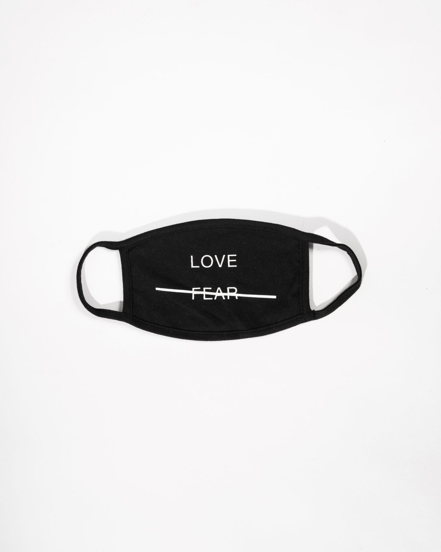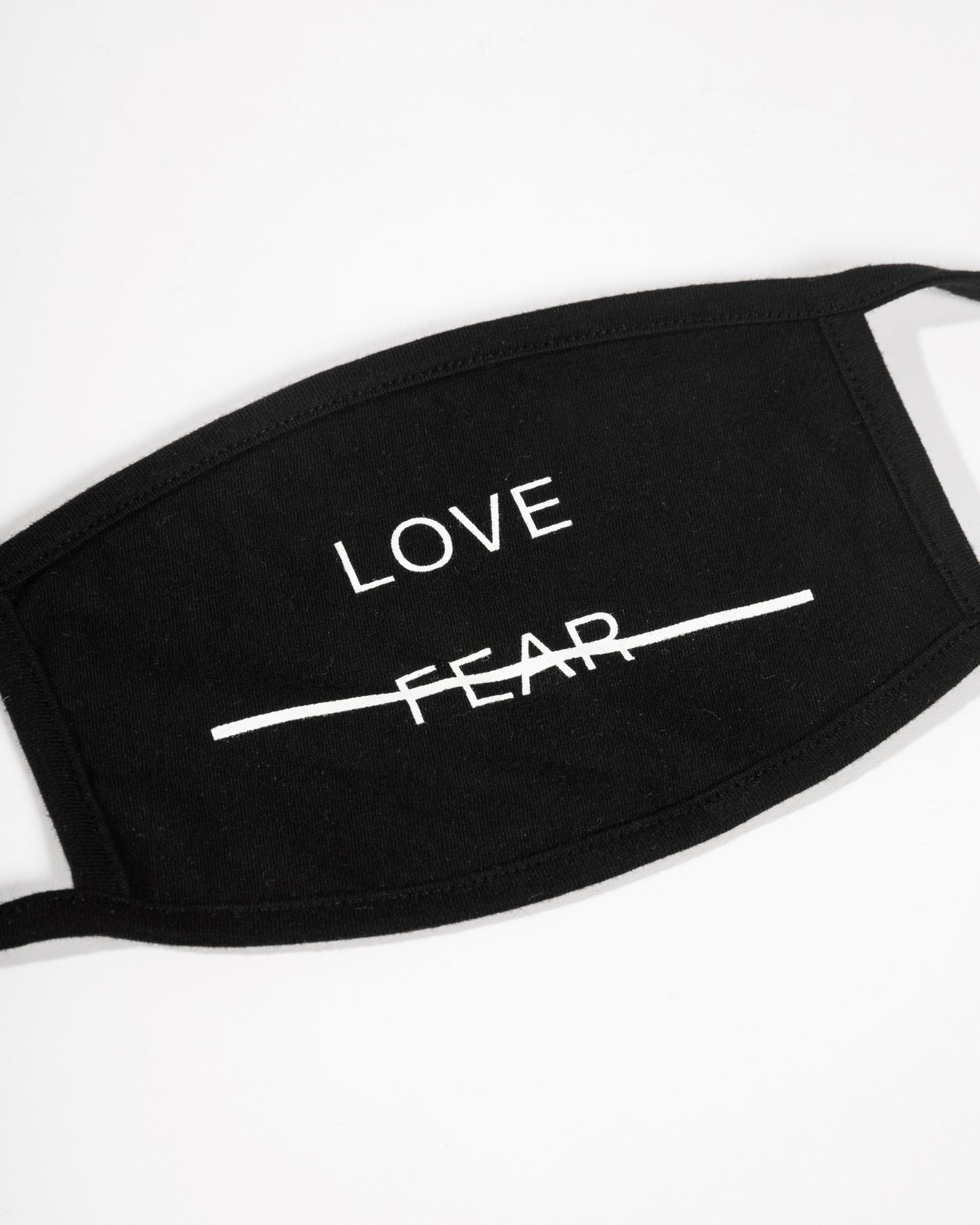 No fear, just love...and we'll get through this. Black cotton mask with screen printed love not fear graphic.