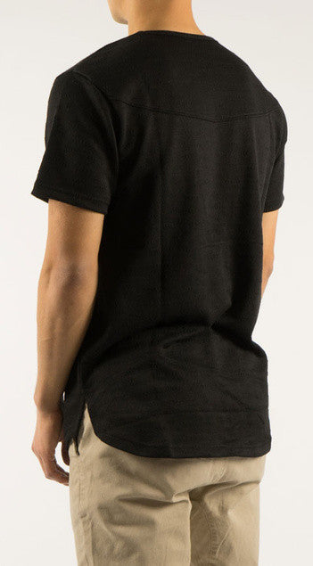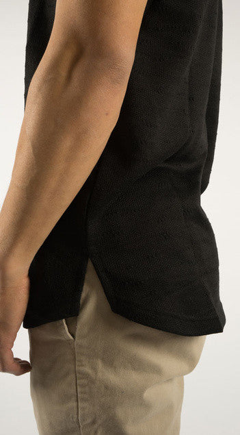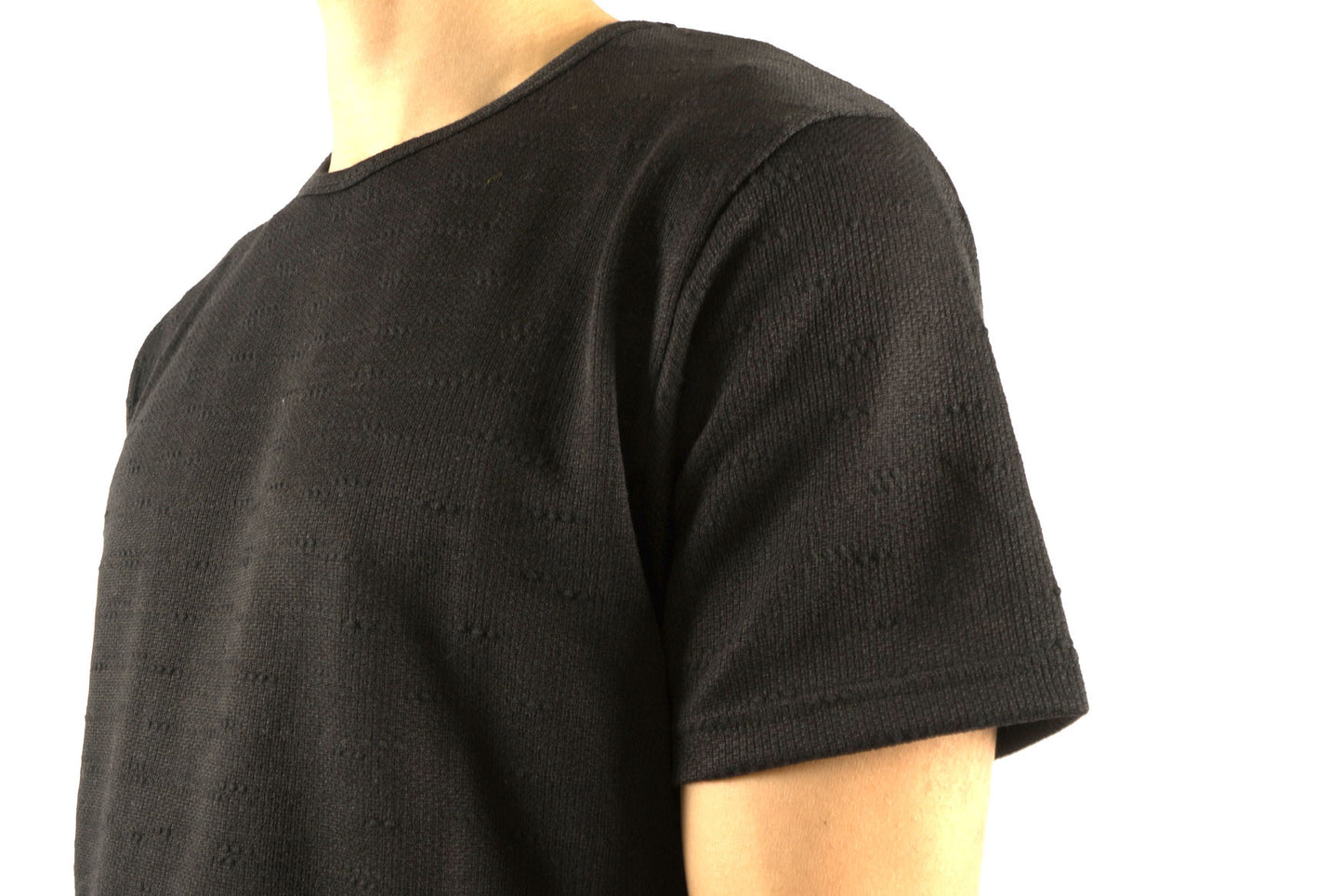 A twist on the classic black tee. Features a subtle woven pattern on a cotton poly tee.