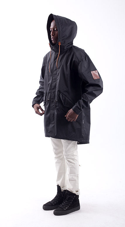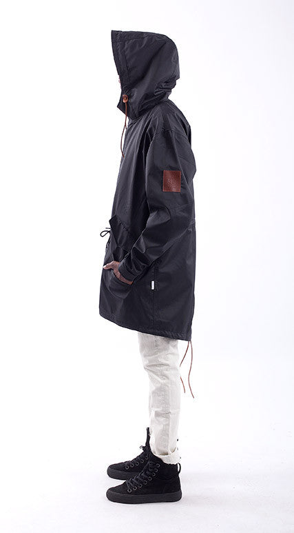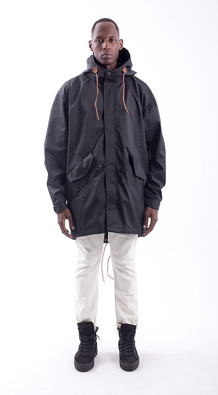 Nylon trench jacket with elongated fishtail back. Features hidden zipper with snap closures, two snap front pockets, and two slit front pockets. Leather drawcord stoppers at hood. Adjustable drawcord at waist and custom branded batch on left arm.
