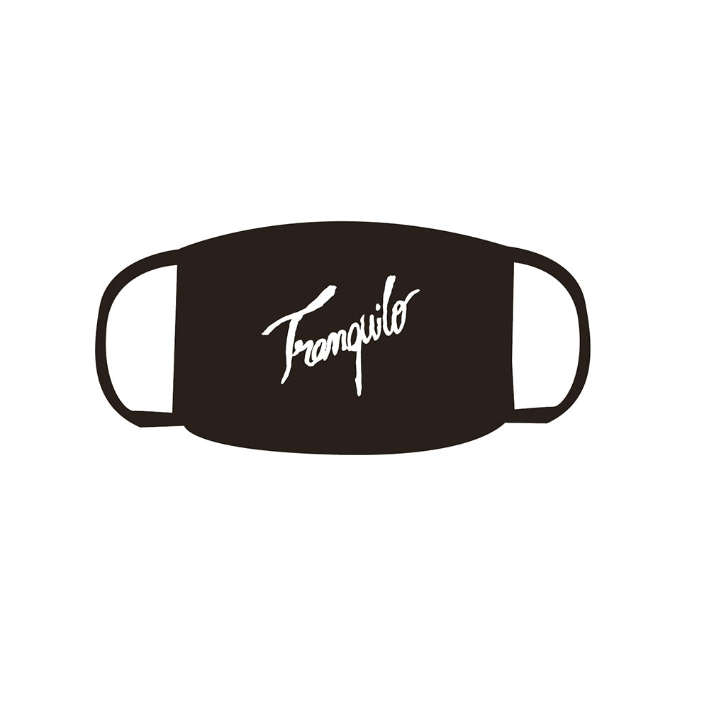 Stay calm and mask on. Black cotton mask with white Tranquilo graphic.• 100% organic cotton mask• Reusable, machine wash approved• Rib binding ear loops for a secure fit