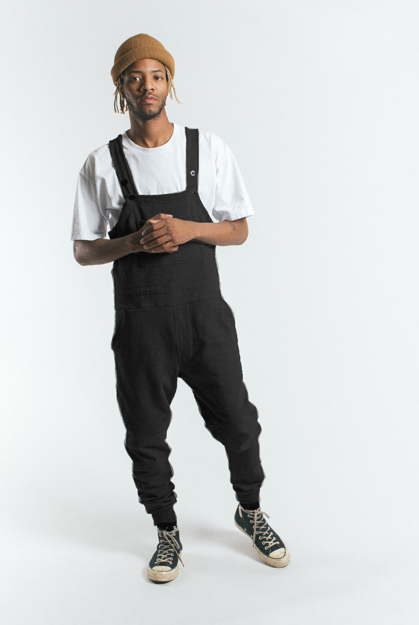 Black cotton fleece overalls with adjustable straps. Front chest pocket and two welt pockets. Three button side closure near waist.