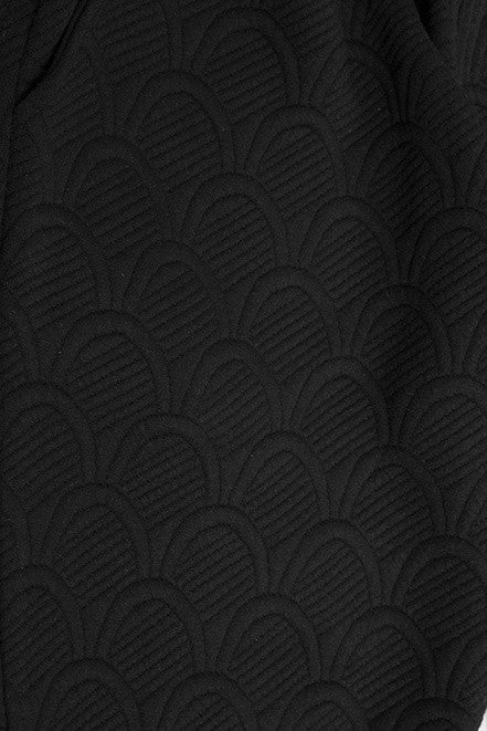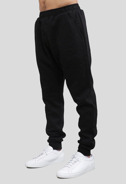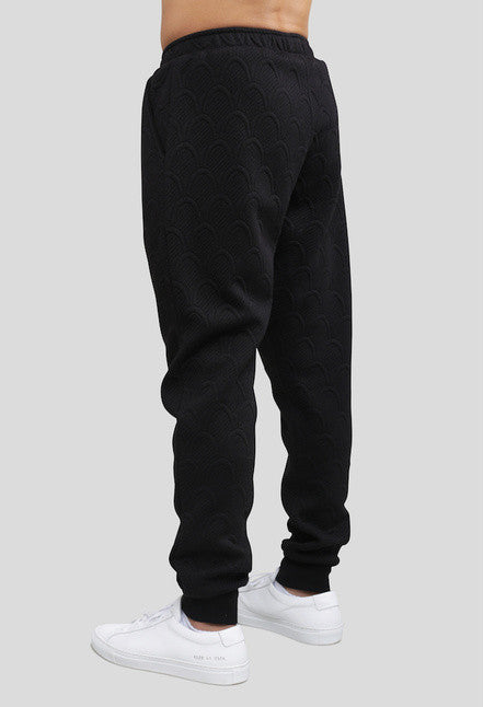 Black poly joggers with allover scalloped design. Drawstring & elastic waist with black cuffs. Two front pockets and two back pockets. Custom VSOP branded label on left back pocket.
