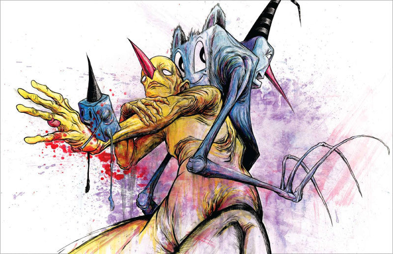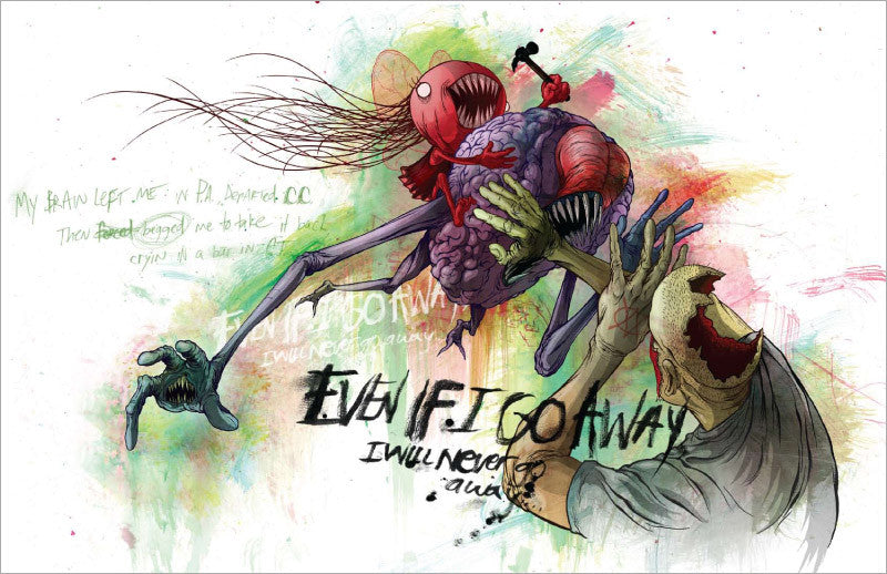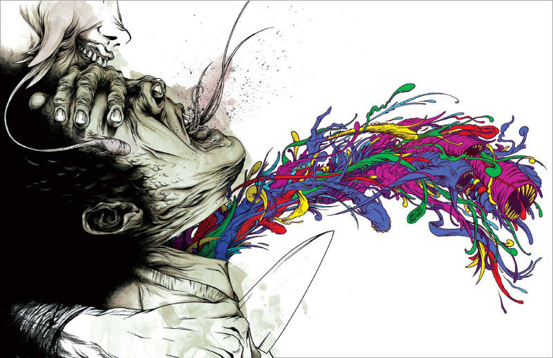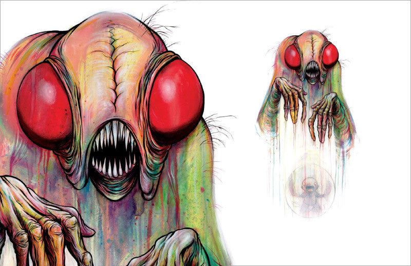 This newest collection expands upon his previous work, showcased in Awful Homesick, to bring us a broader picture of the extent of his twisted genius and the dark themes that run throughout his work. Yet, amongst the entrails and decapitations, the gaping maws of razor-sharp teeth, improbable appendages and suppurating fleshy masses, we discover a vein of goodness, of humanity.