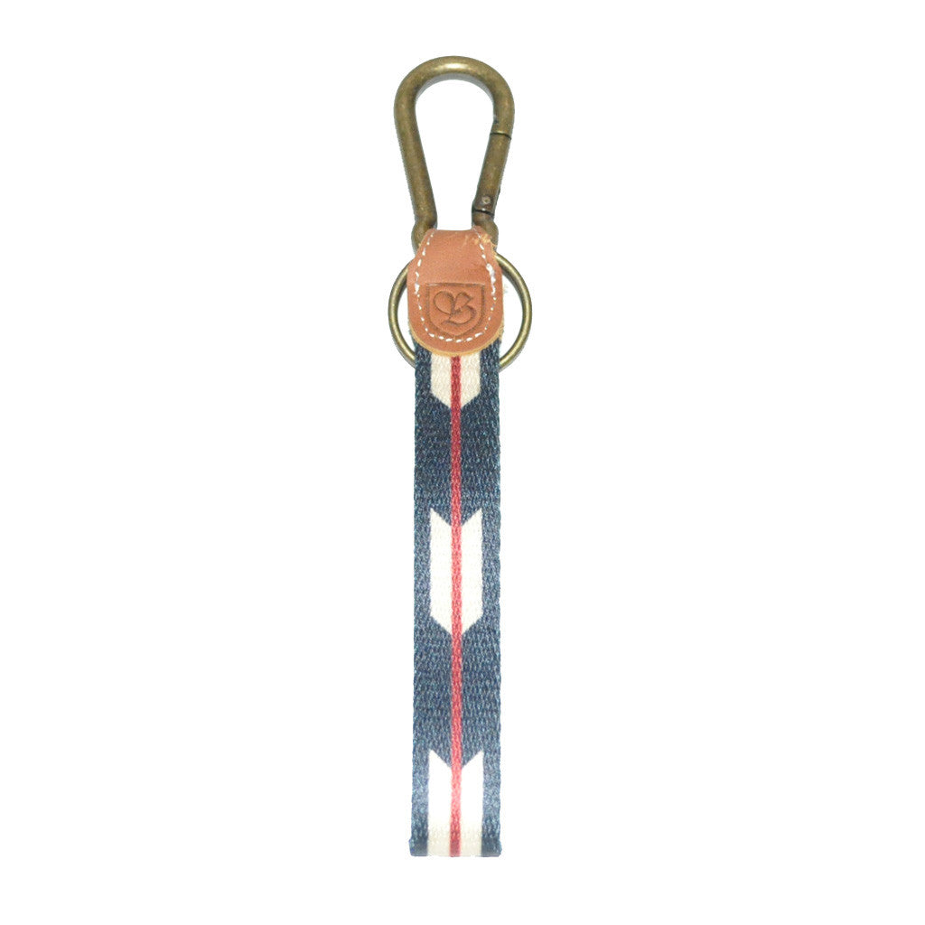 Leather loop keychain with custom patterned webbing. Features carabiner and custom debossed Brixton stamp.
