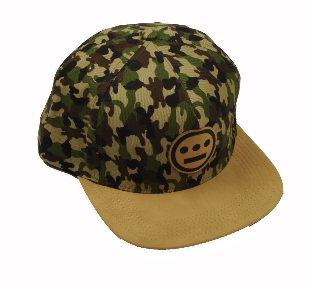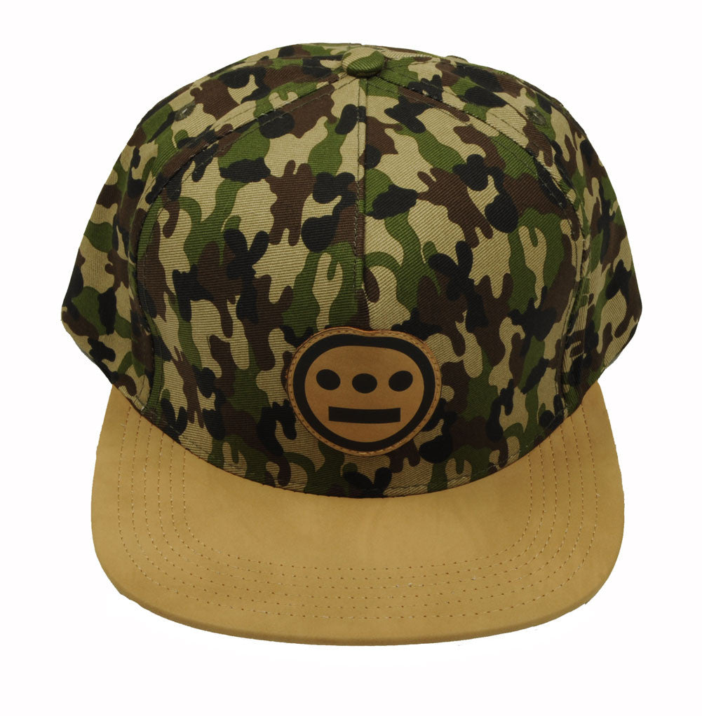 DelHIERO 6 Panel Cap. Camoflage Print base with tan microsuede bill and microsuede logo patch. Adjustable snapback.