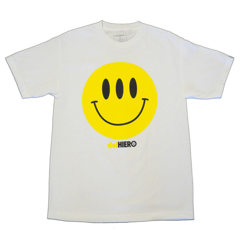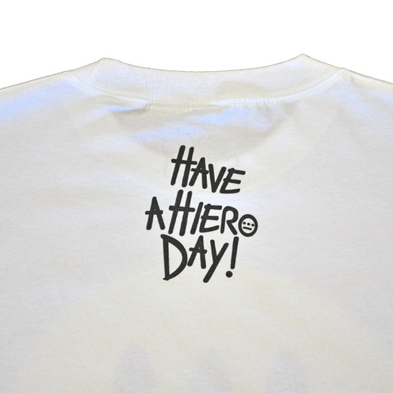 Happy Face Hiero on a white tee. Hiero logo on a sleeve tag, back print says, "Have a Hiero Day"