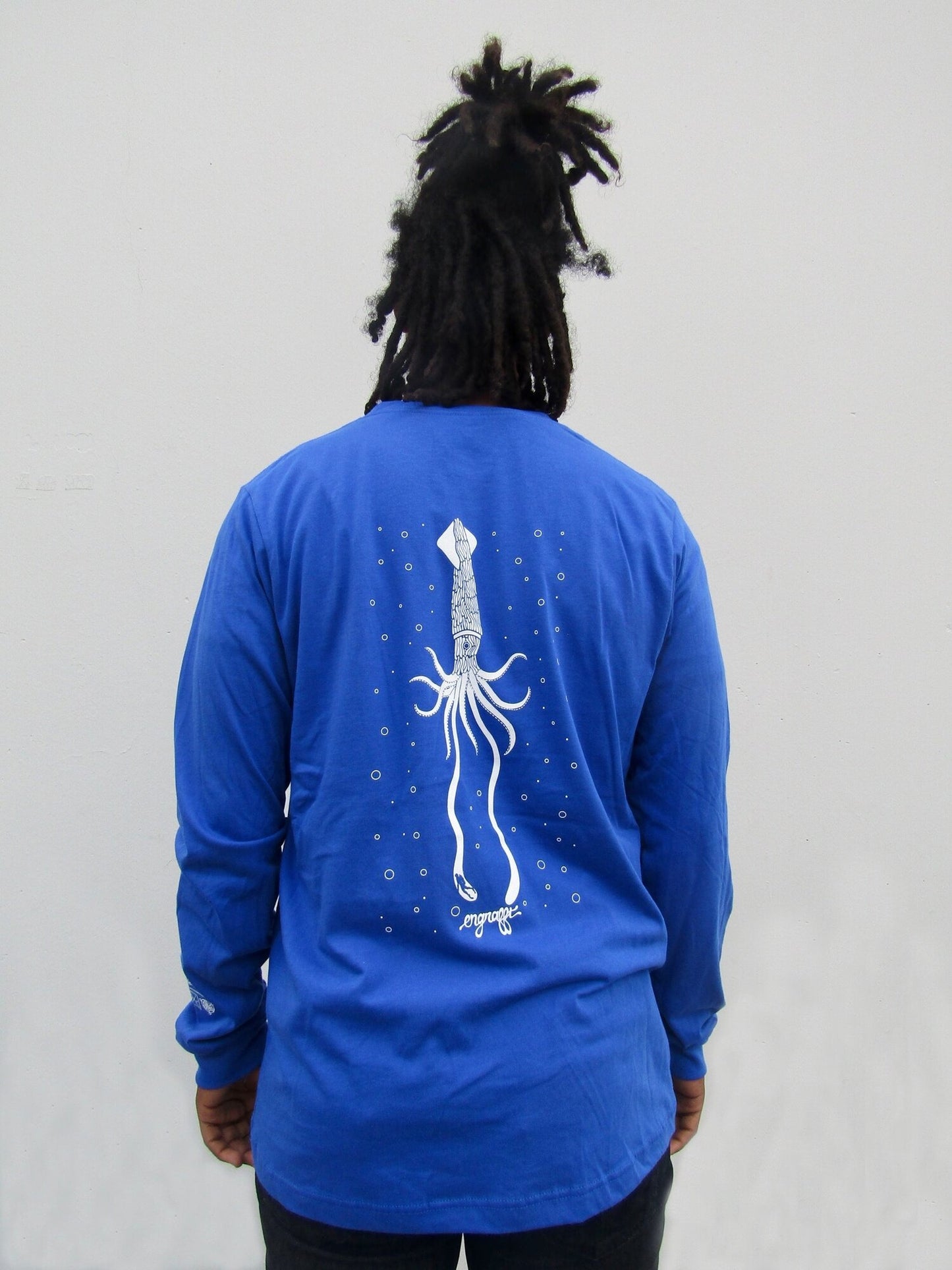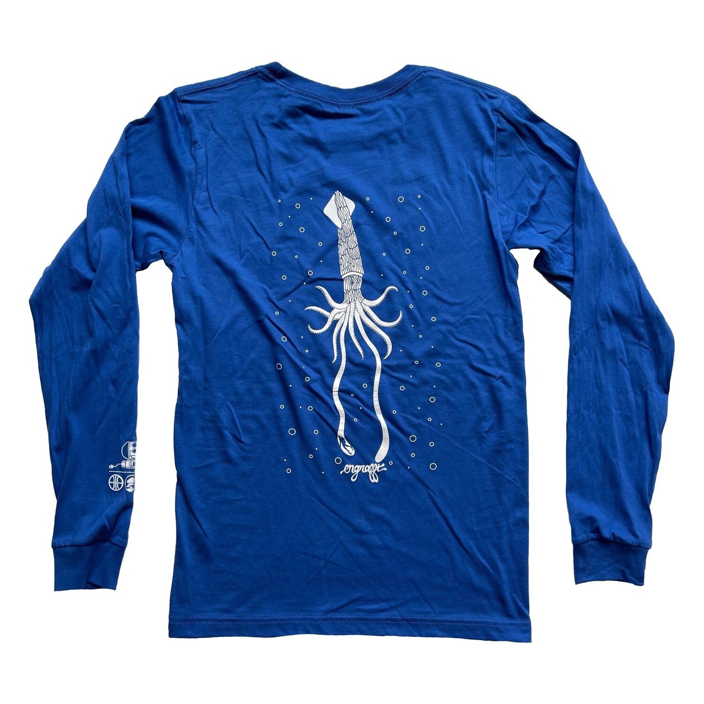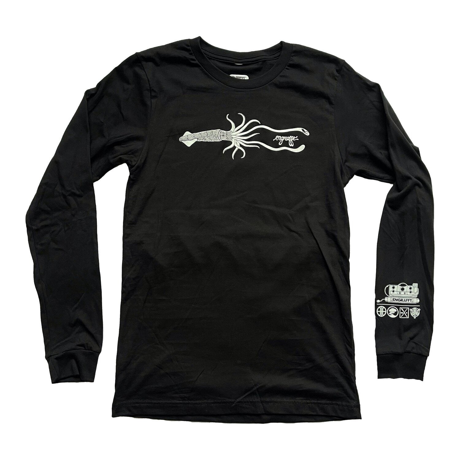 Surfacing from the depths to join the ENGRAFFT line is one of the ocean’s most rare and large creatures, the Giant Squid! This Giant Squid features Derek’s “Tendrils Living Style” and a small diver for aesthetic and scale. With the Giant Squid artwork on front and back, and multi-symbol print on the sleeve. 100% Airlume combed and ring-spun cotton long sleeve tee.