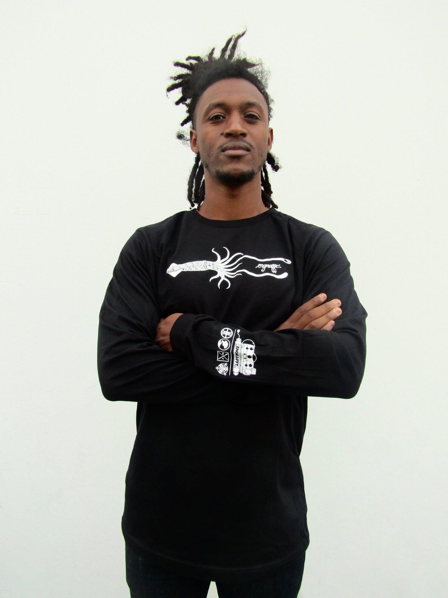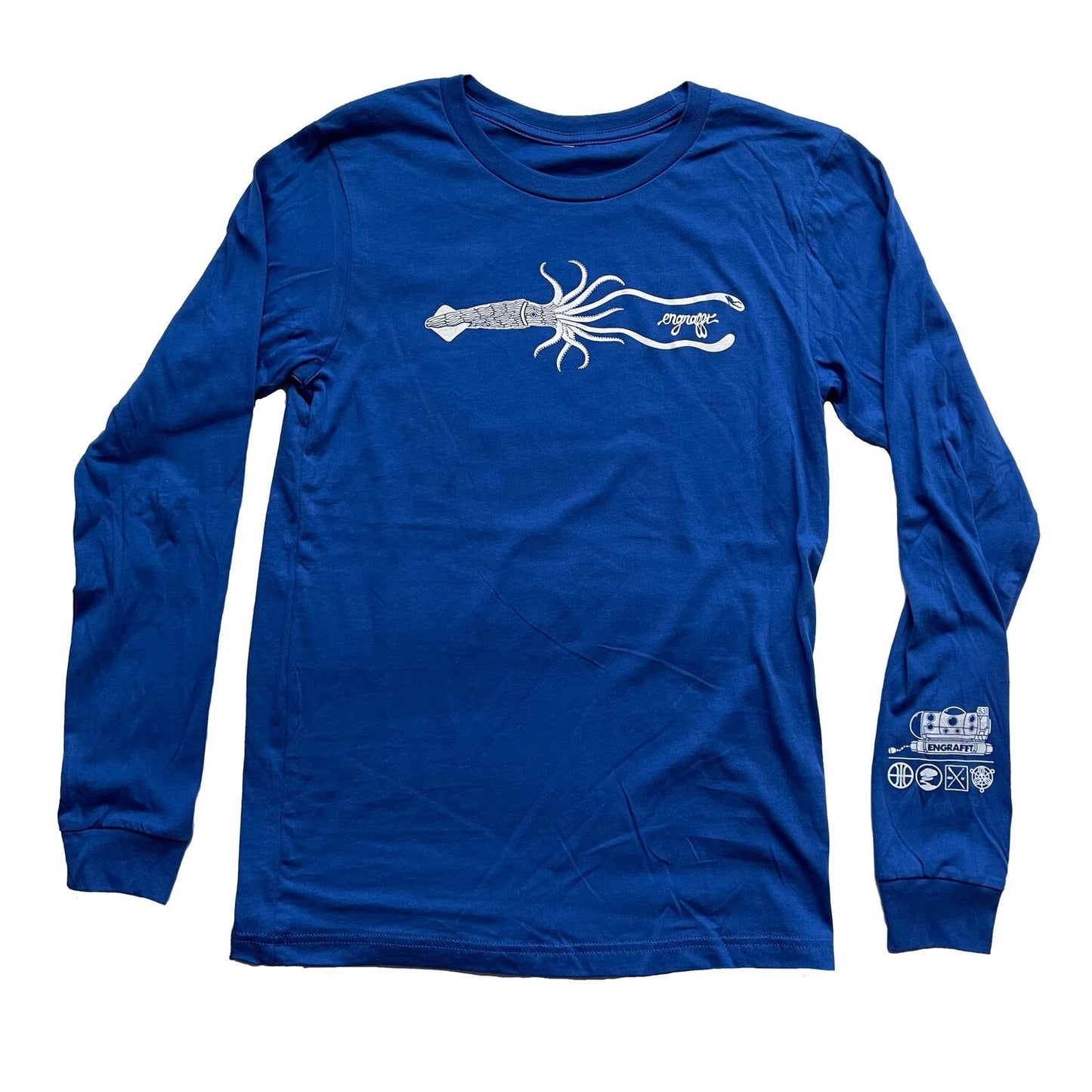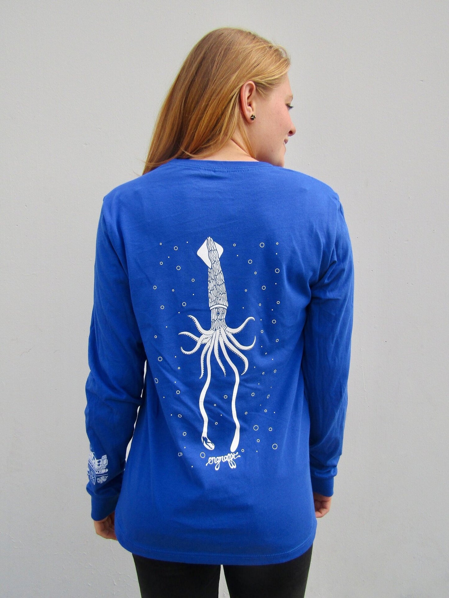 Surfacing from the depths to join the ENGRAFFT line is one of the ocean’s most rare and large creatures, the Giant Squid! This Giant Squid features Derek’s “Tendrils Living Style” and a small diver for aesthetic and scale. With the Giant Squid artwork on front and back, and multi-symbol print on the sleeve. 100% Airlume combed and ring-spun cotton long sleeve tee.