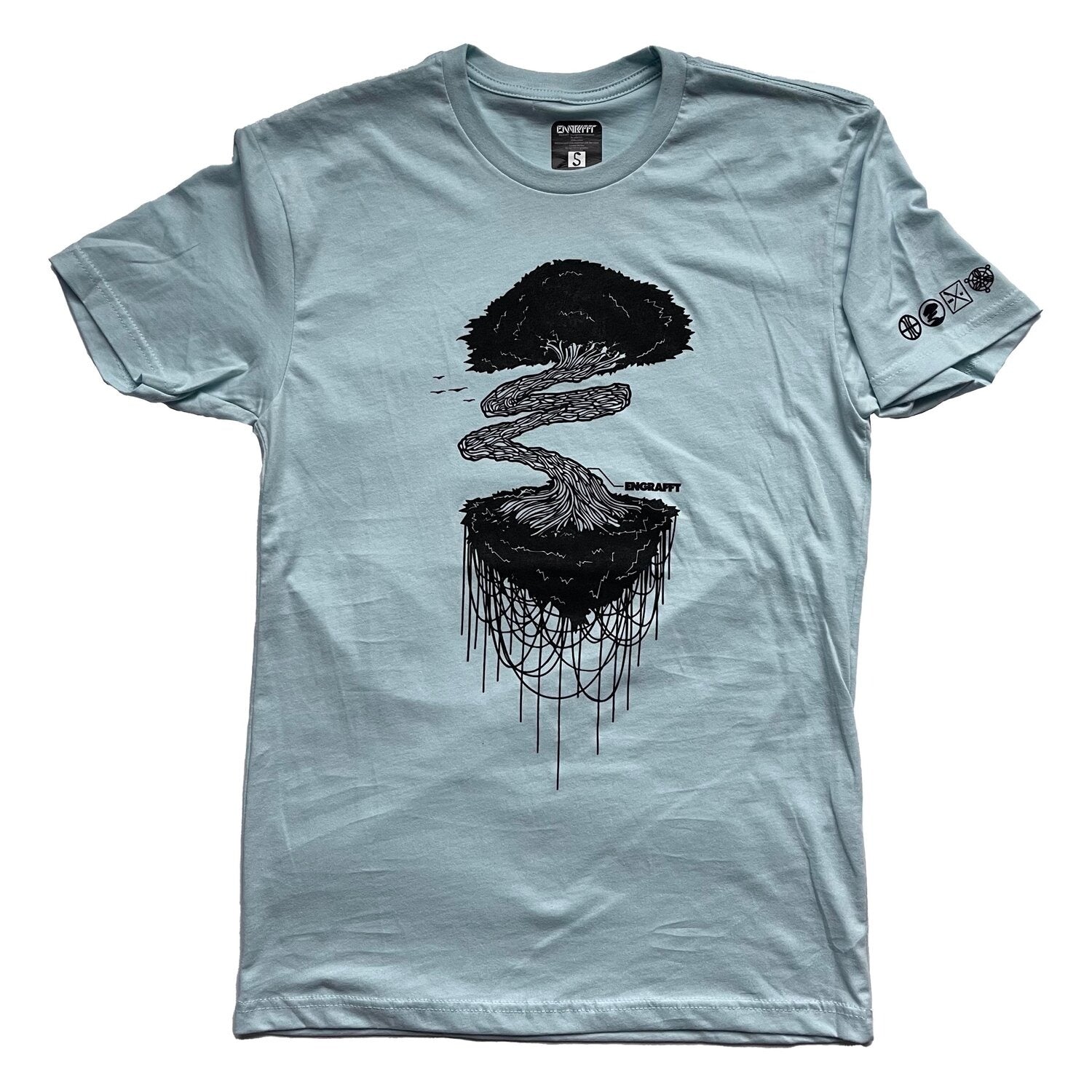 The fourth generation of the 'Grafted Tendril Bonsai' design floats in with subtle design additions while being true to and reflective of the original. The Grafted Tendril Bonsai represents part of ENGRAFFT’s concept of being a combination of various 'Living' (graphic) styles like different trees being grafted together. In addition, this design was created through a grafted process- beginning in 'organic' form as a pen and ink drawing, then going into digital form, and then finally being screen printed by the same hand from which the art came..