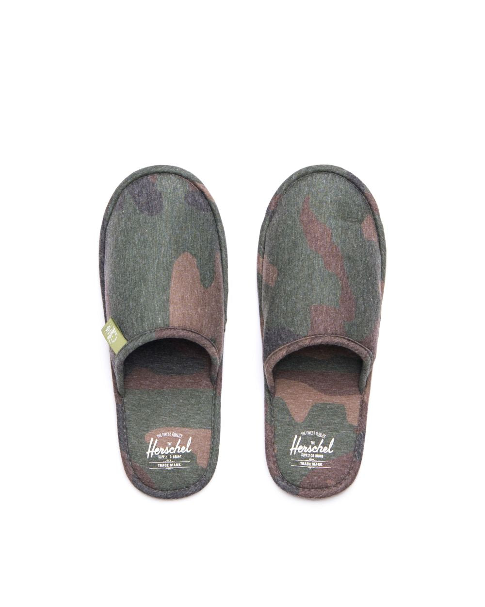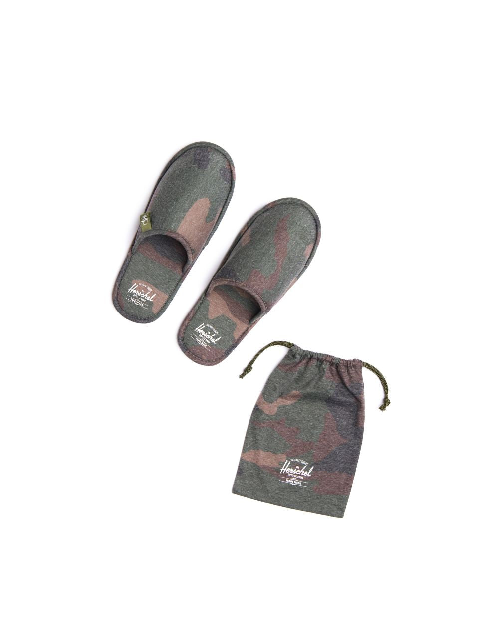 Muted camo slippers for your travels. They come folded in an easily packable matching pouch.