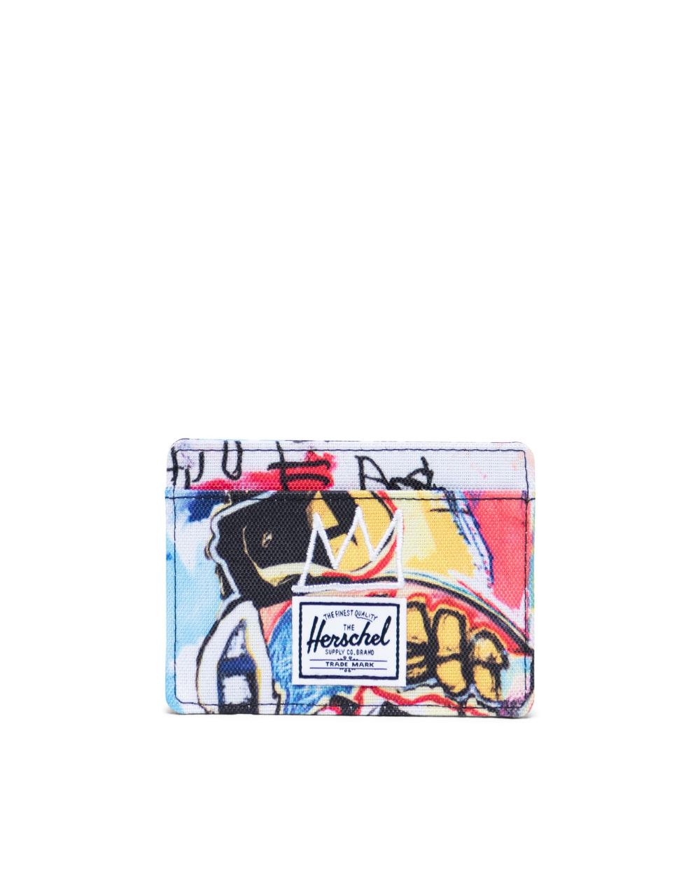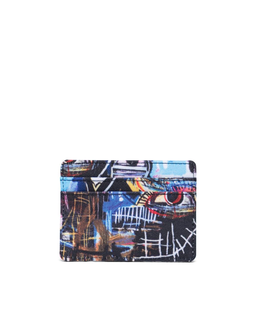 Showcasing Basquiat's iconic painting from 1982. The Charlie Wallet is a clean and compact card holder wallet. Coated poly fabric with tonal black striped liner and multiple credit card slots.
