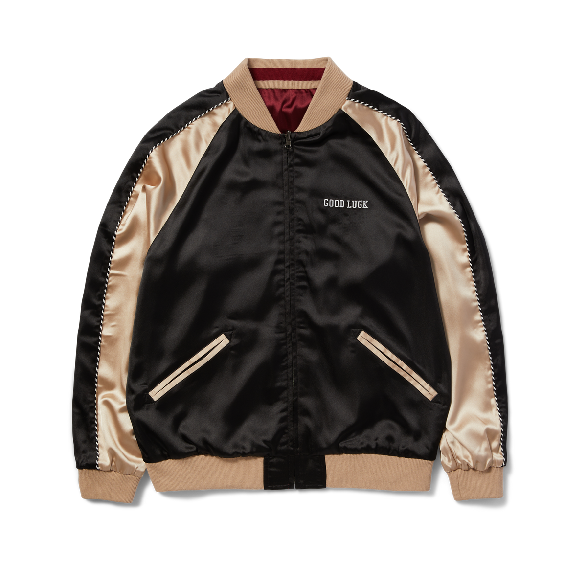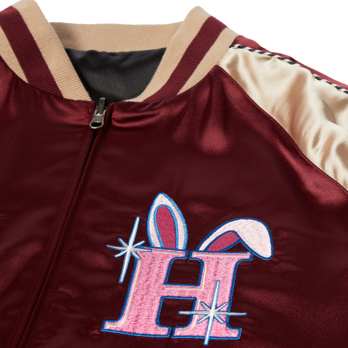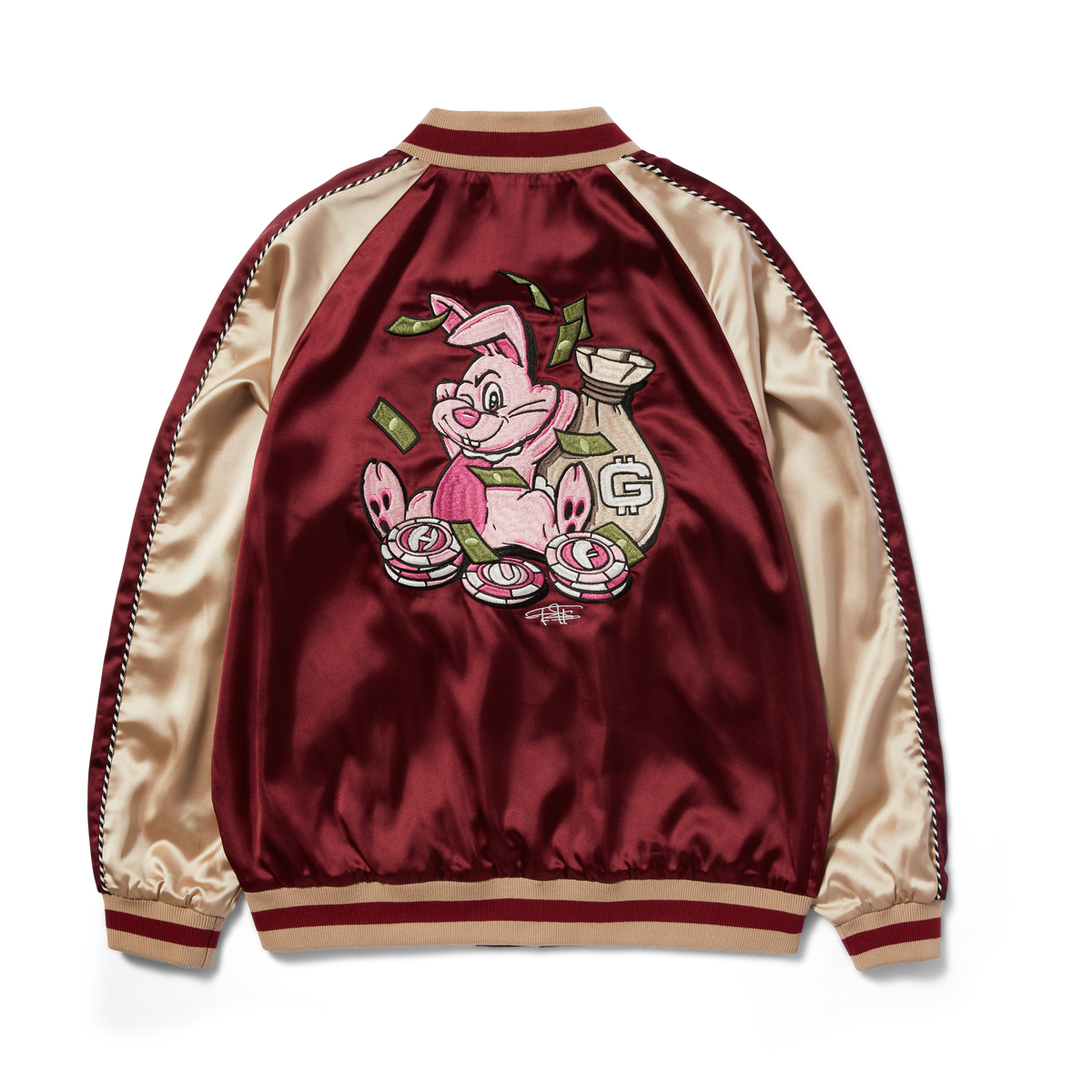 HUF x Freddie Gibbs limited edition collaboration. Zip front souvenir jacket with logo lock up embroidered patches on the chest and Big Boss Rabbit embroidered patch on the back. Features striped piping on shoulders, welt front pockets and ribbed trim on collar/hem/cuffs. Reverse side has "Good Luck" embroidery on the left chest.