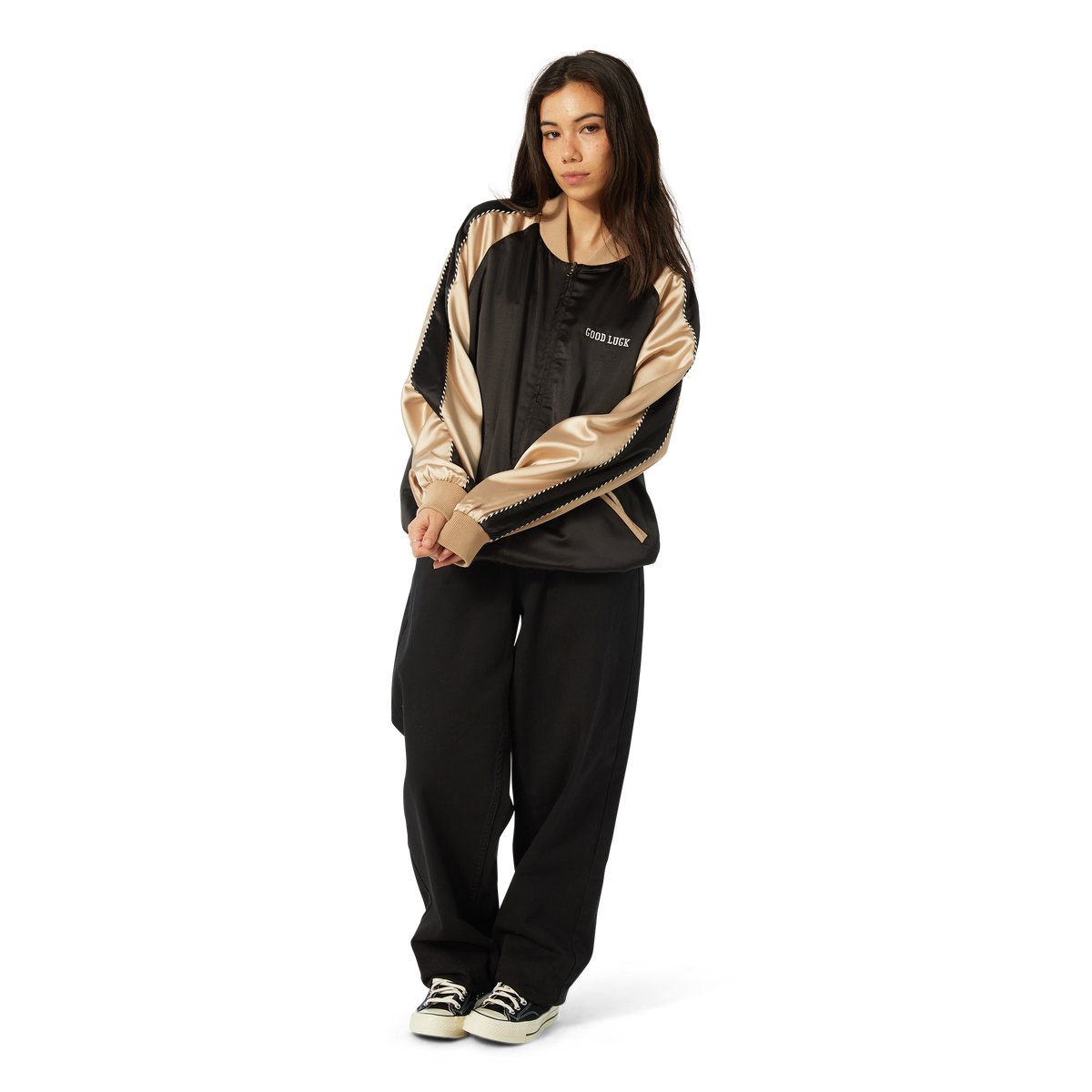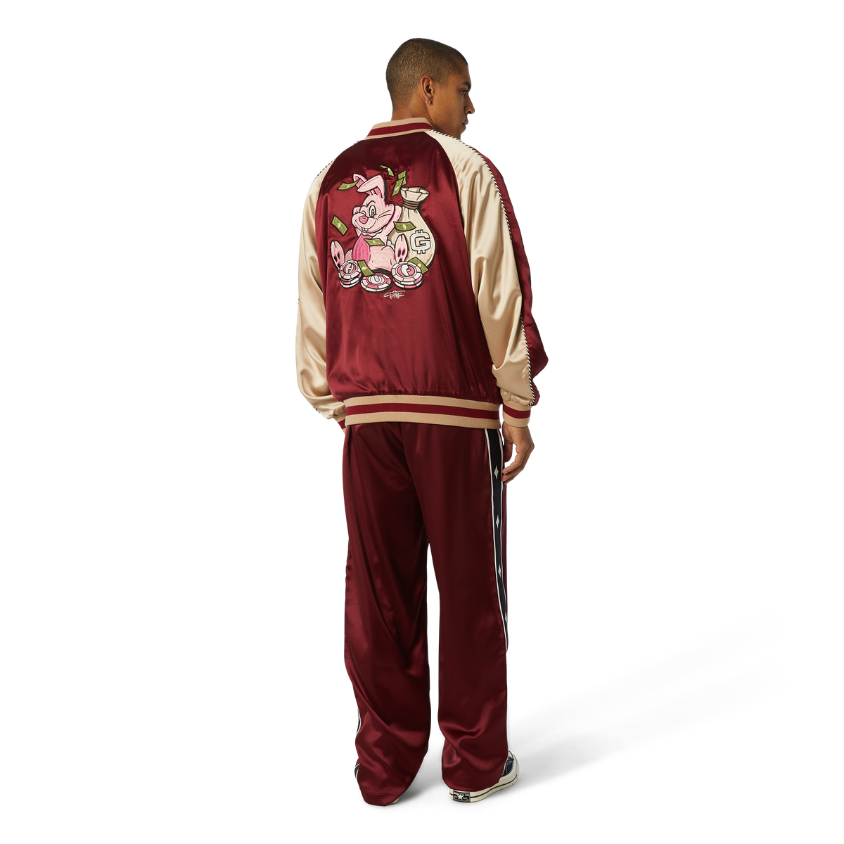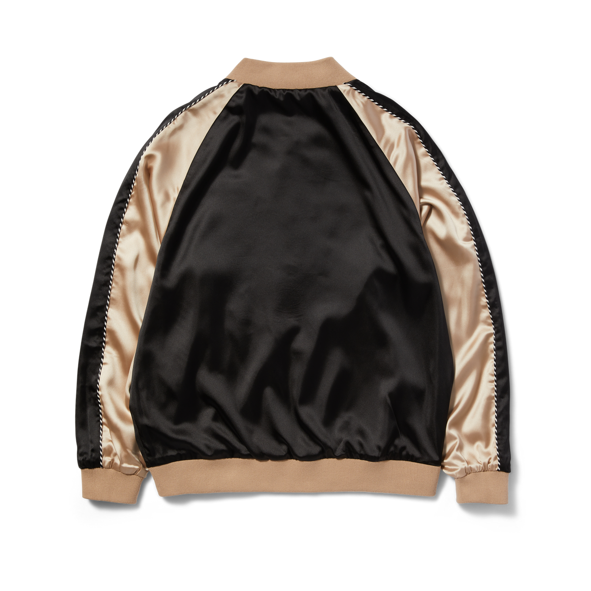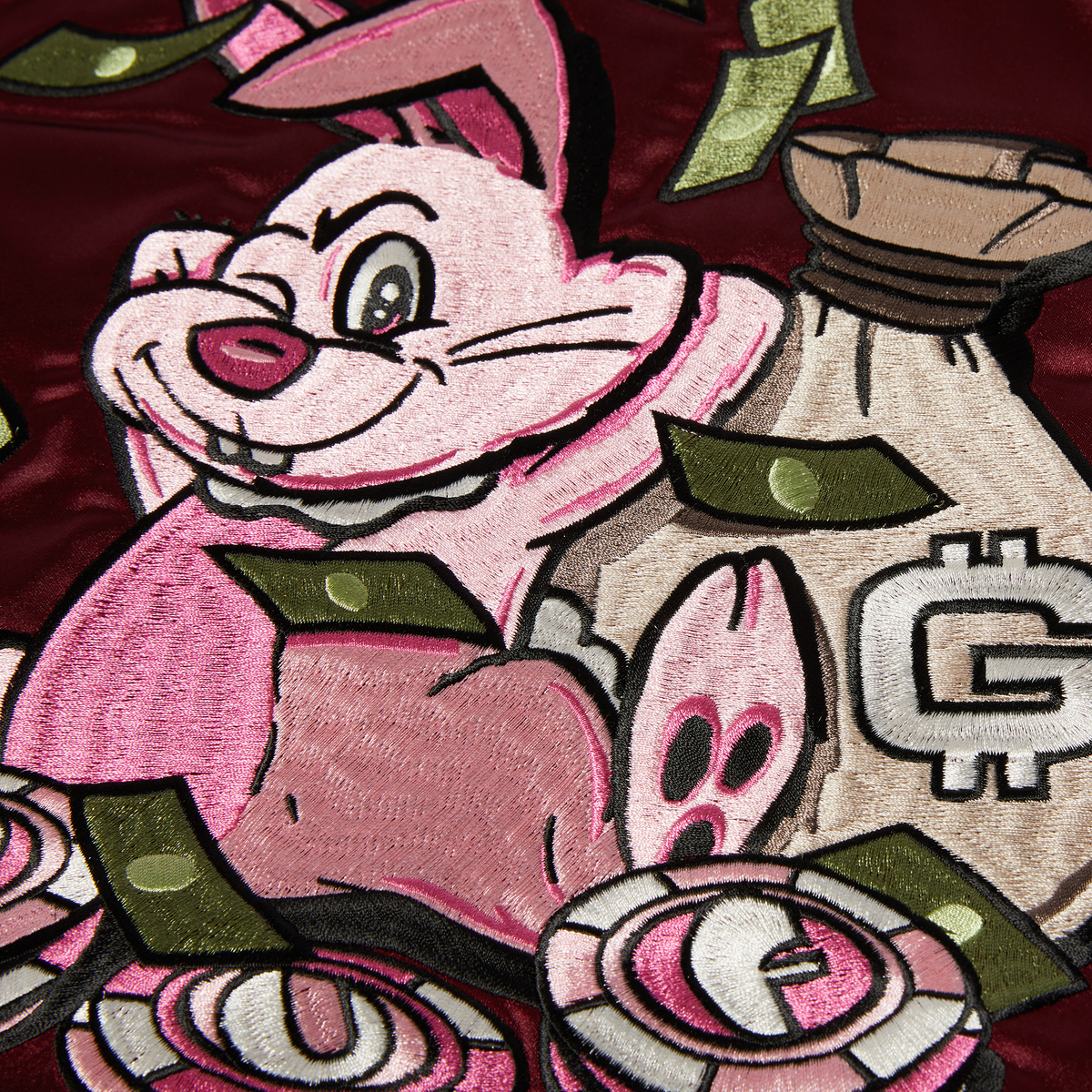 HUF x Freddie Gibbs limited edition collaboration. Zip front souvenir jacket with logo lock up embroidered patches on the chest and Big Boss Rabbit embroidered patch on the back. Features striped piping on shoulders, welt front pockets and ribbed trim on collar/hem/cuffs. Reverse side has "Good Luck" embroidery on the left chest.