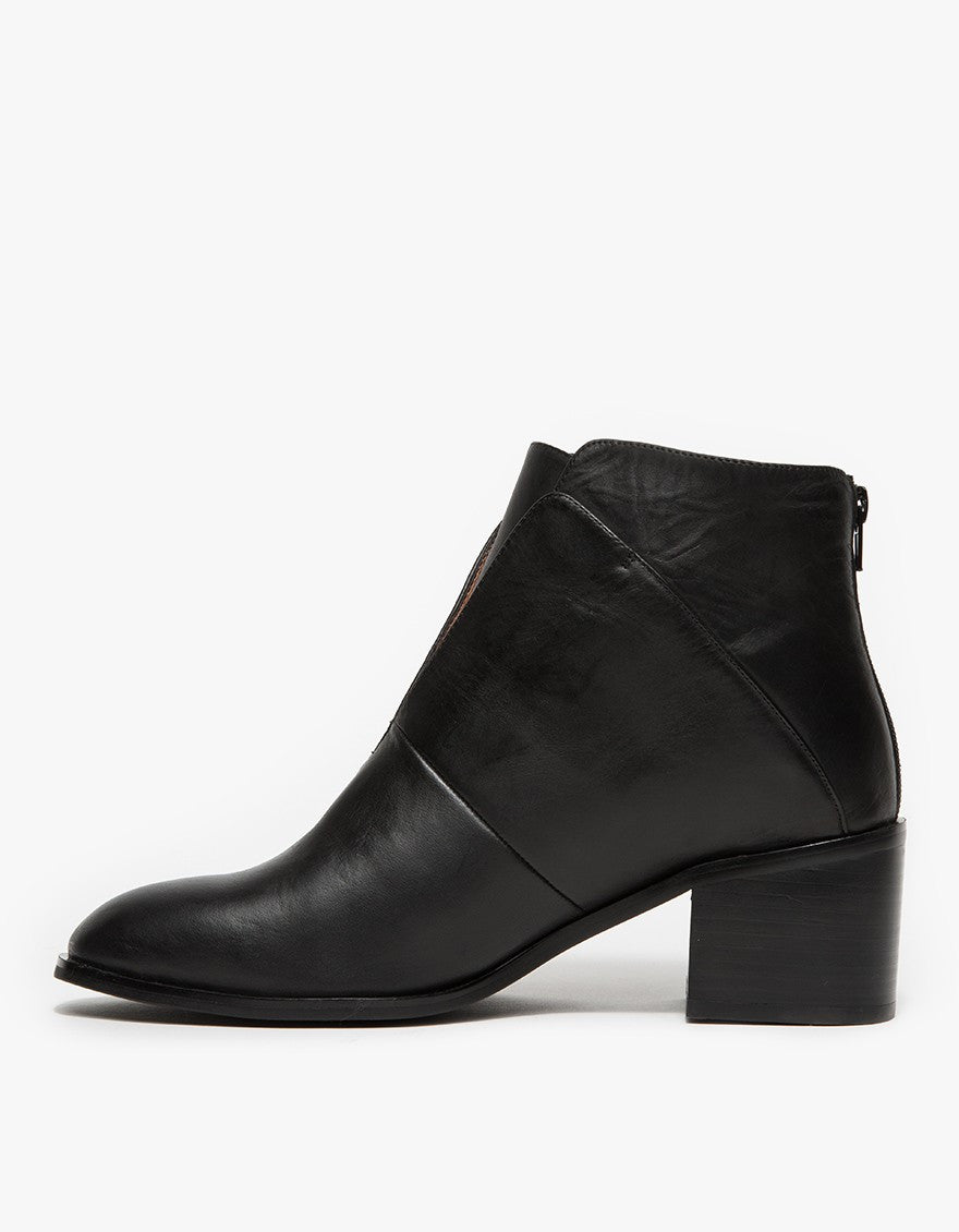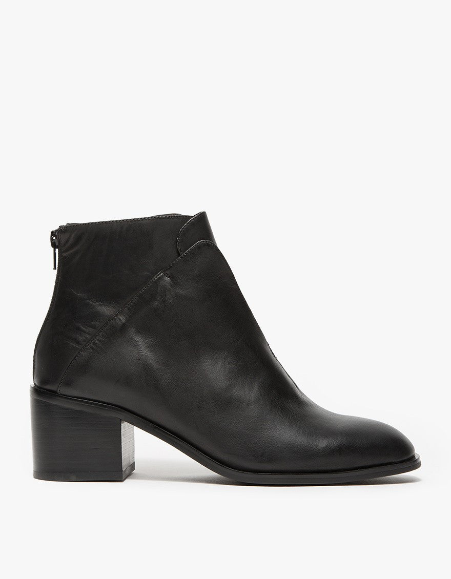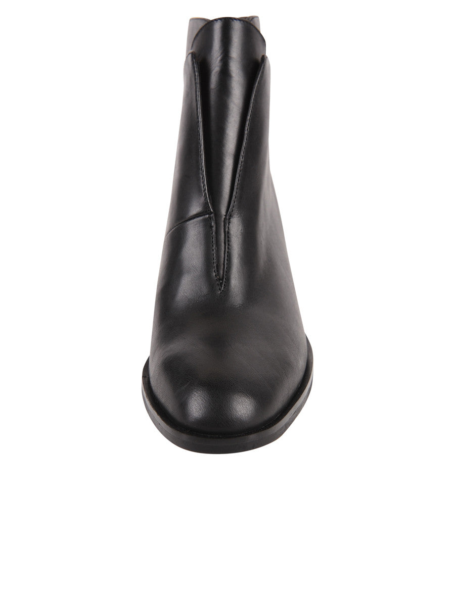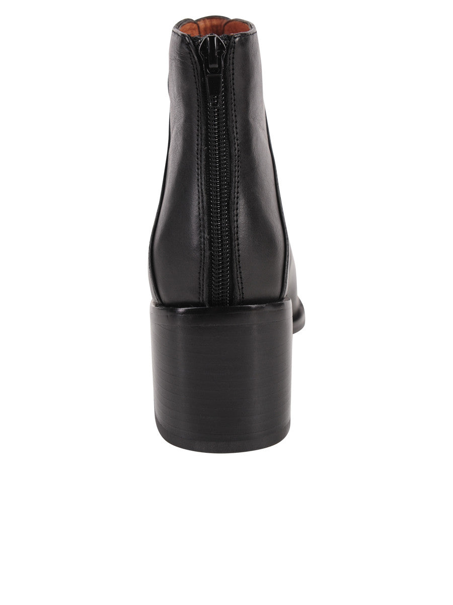 Classic black ankle boot with rounded toe and zipper back. Features front leather tongue design. Leather lining, synthetic sole, and stacked 2.5” heel.