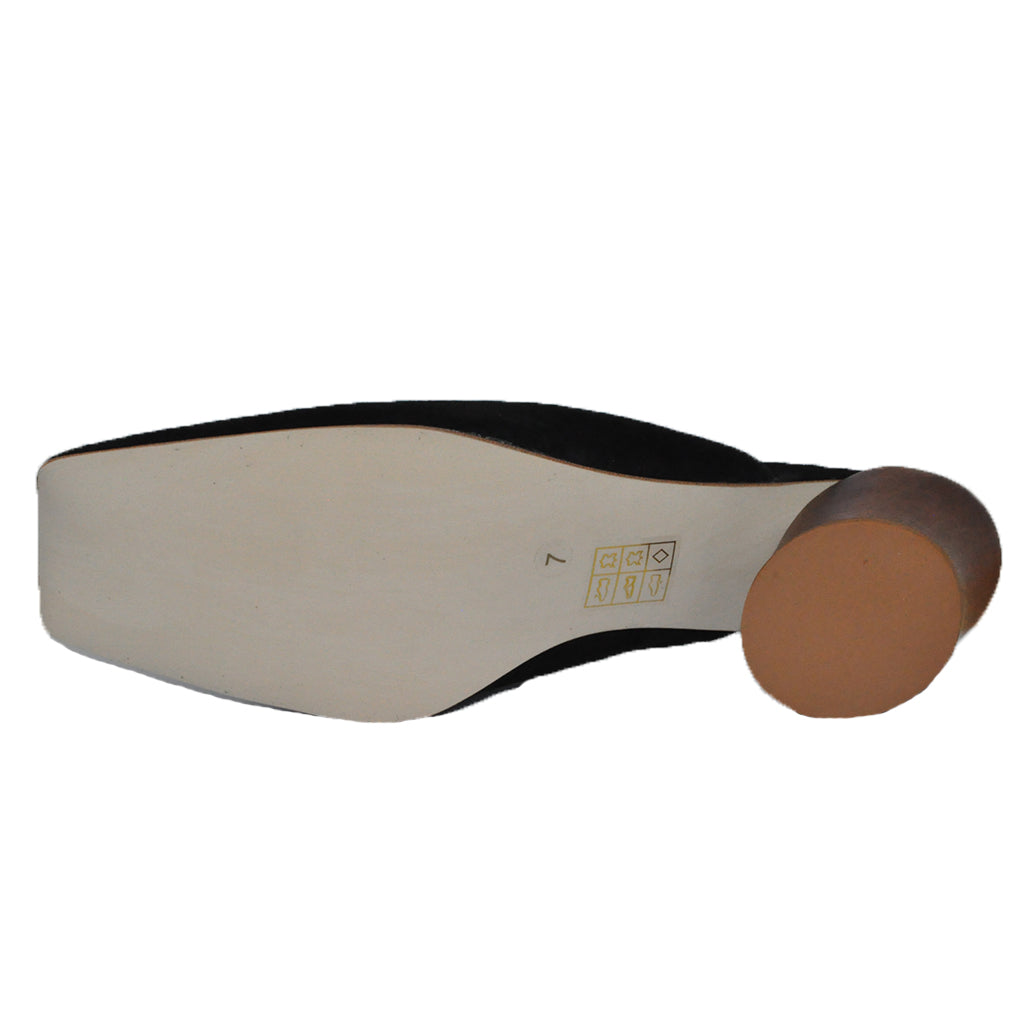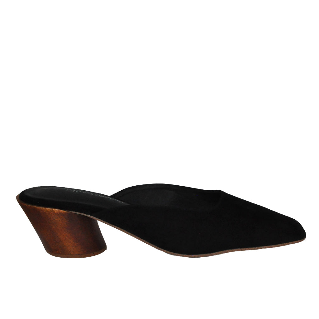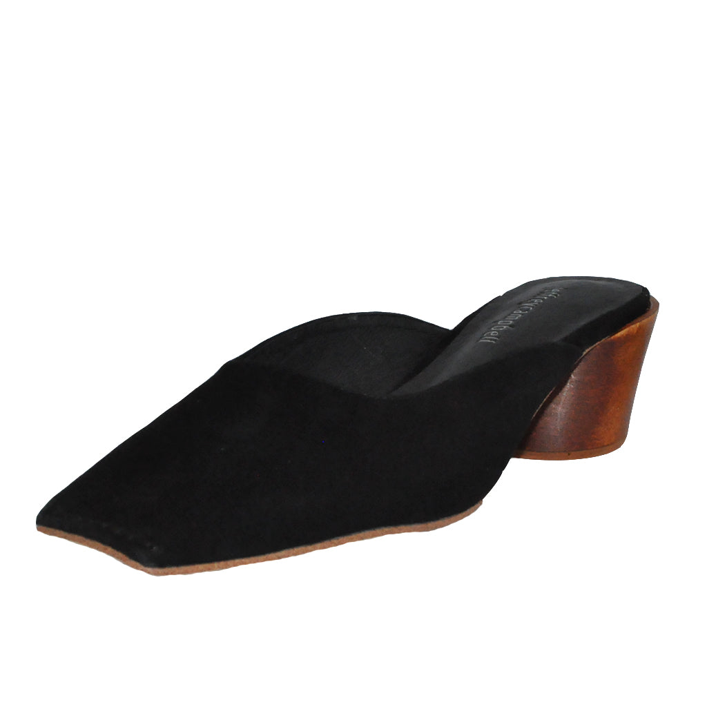 A modern twist on a classic mule. Black suede square toe mules with a tilted cylindrical heel.