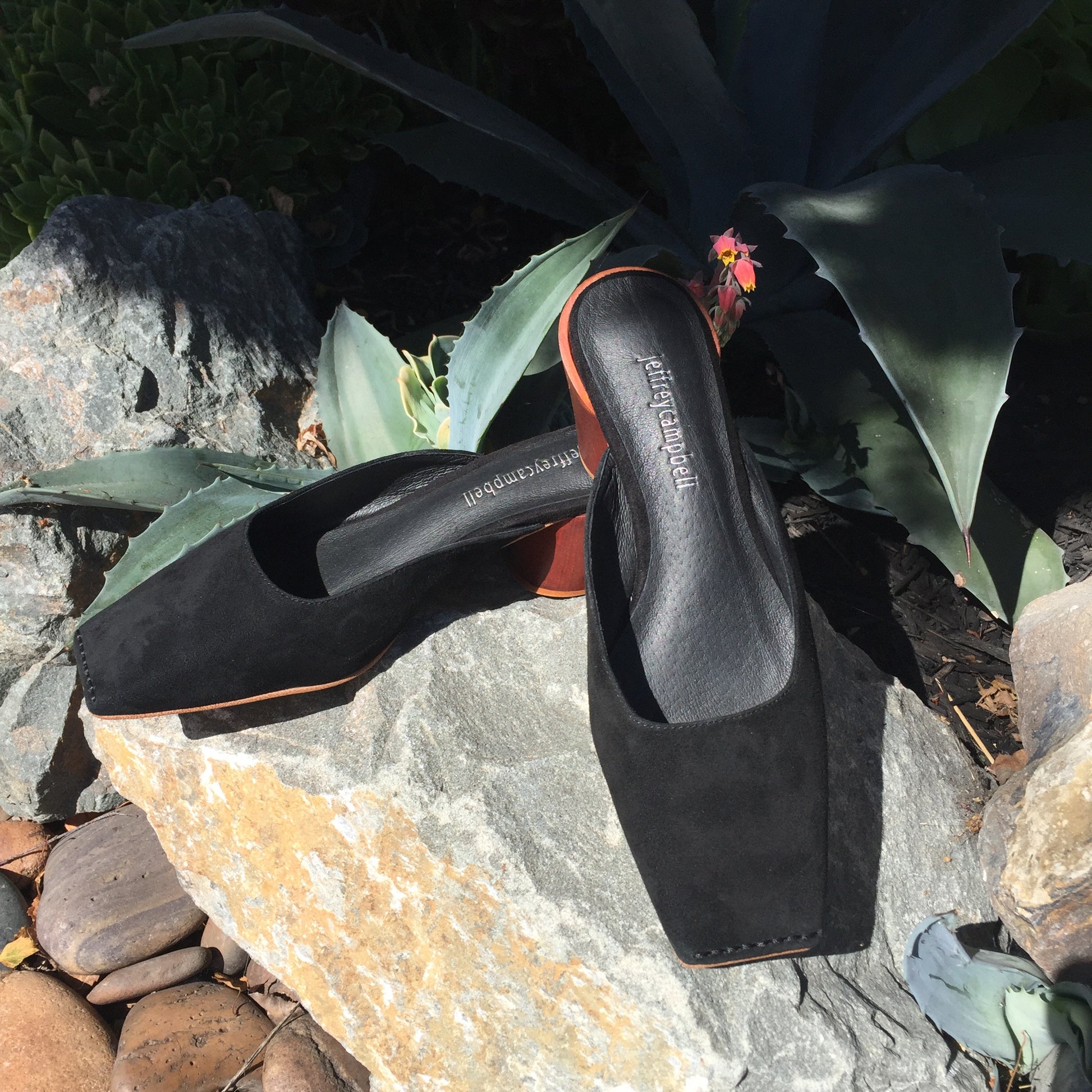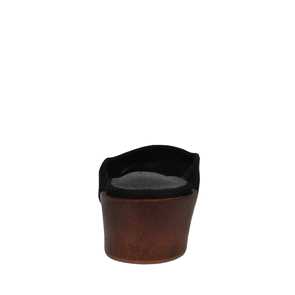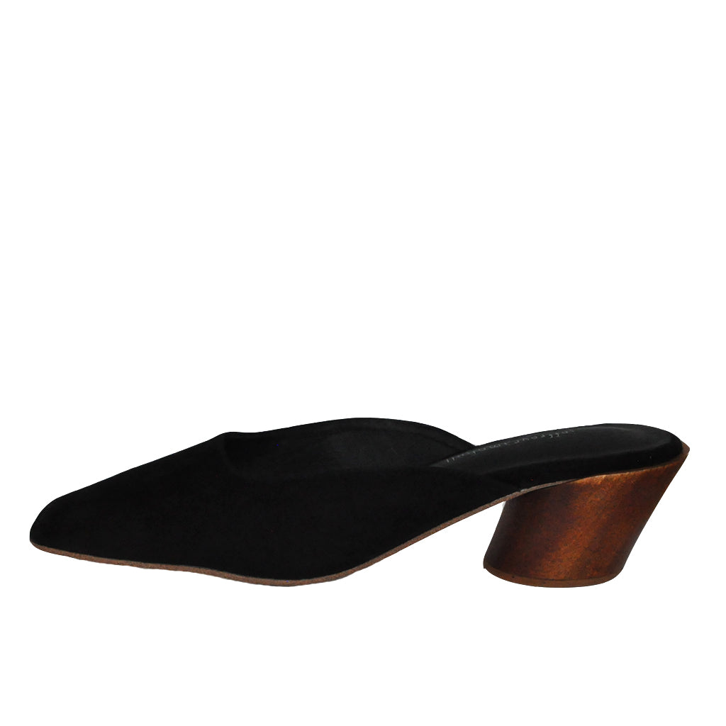 A modern twist on a classic mule. Black suede square toe mules with a tilted cylindrical heel.