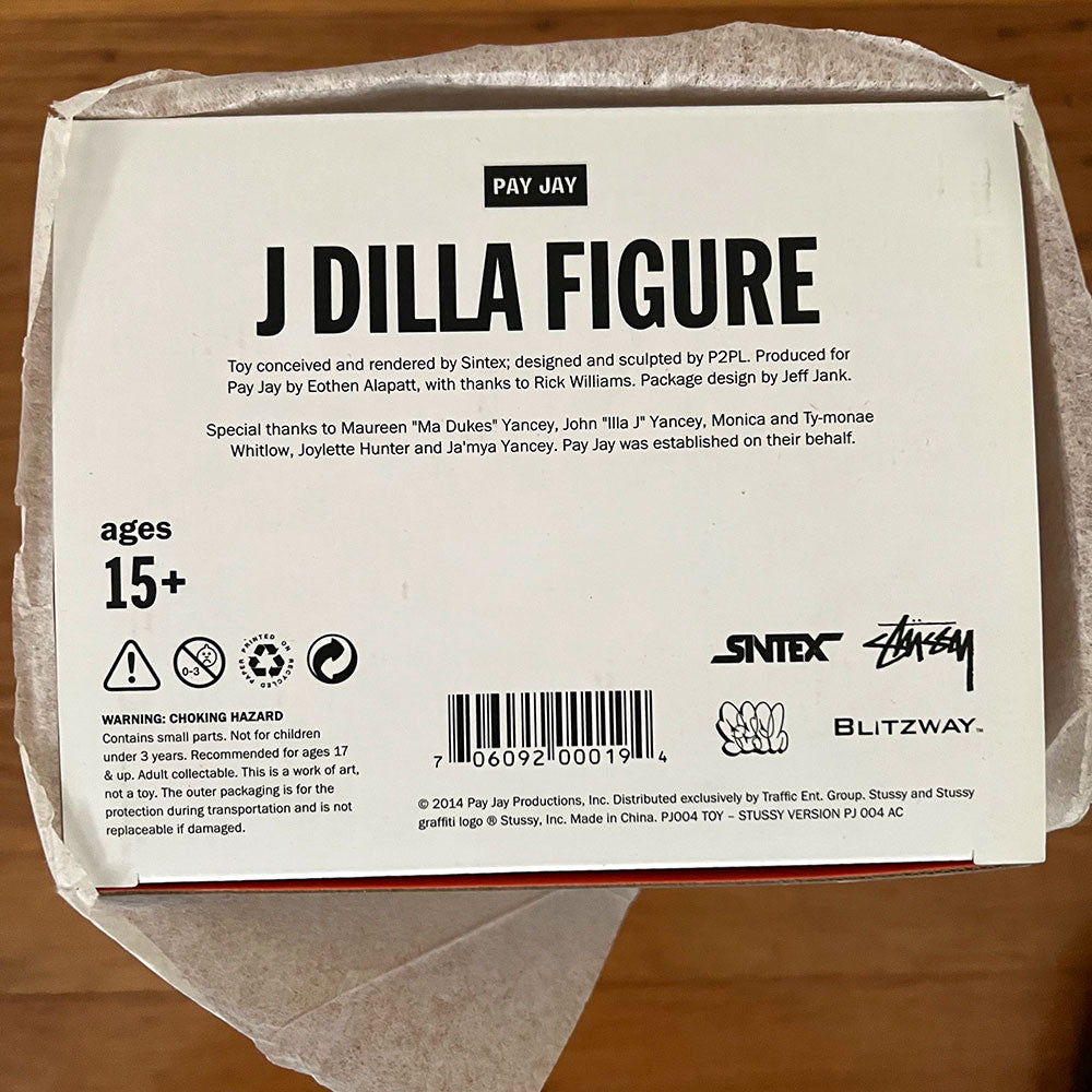 The J Dilla Figure is an official Pay Jay Productions release, produced under the oversight of the Estate of James Yancey. The Figure was conceived and rendered by Detroit artist Sintex, designed and sculpted by Seoul-based toy artist P2PL. Detroit fitted hat, donut chain, MPC, and Stussy shirt. Manufactured by Blitzway. From the original release of 2,000 (2014).