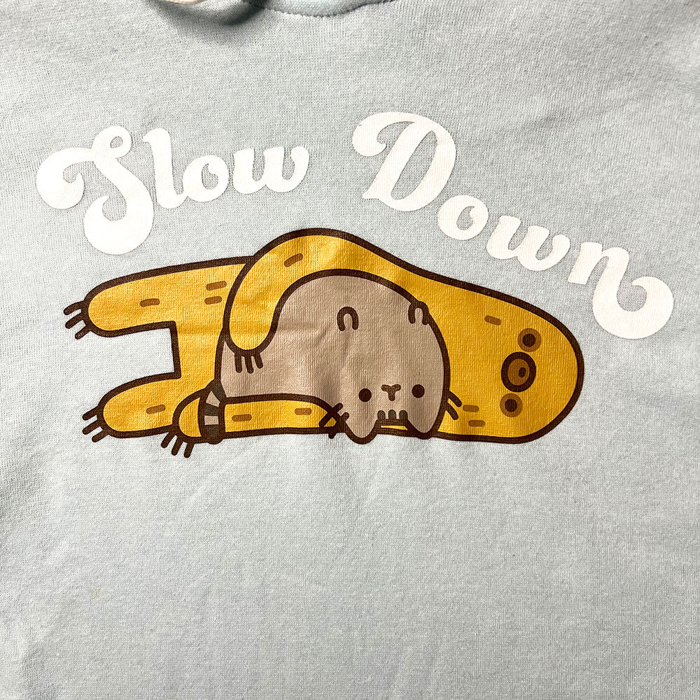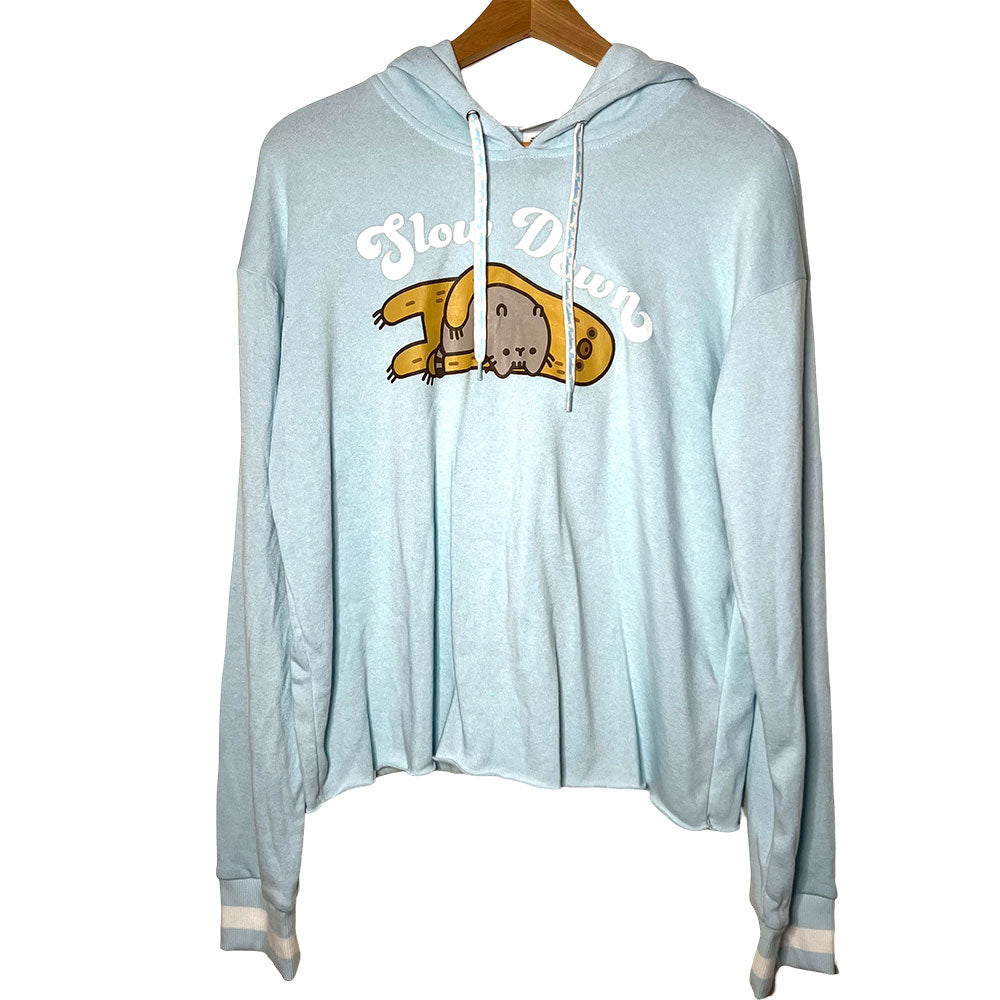 Light blue cropped hoodie with a graphic image of Pusheen and Sloth with the words, "Slow Down" in script above. Custom Pusheen drawcord and raw edge bottom hem.