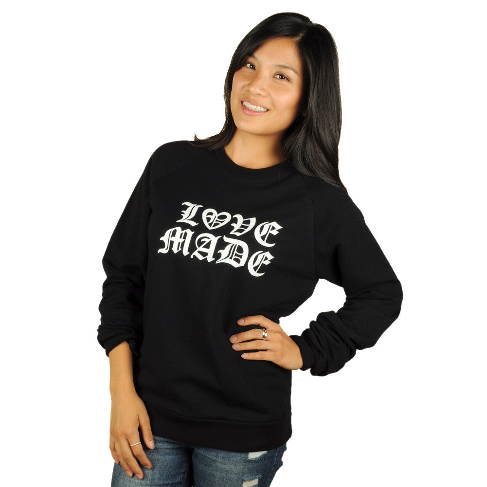 Black crewneck fleece with "Love Made" screened in Old Engish font.