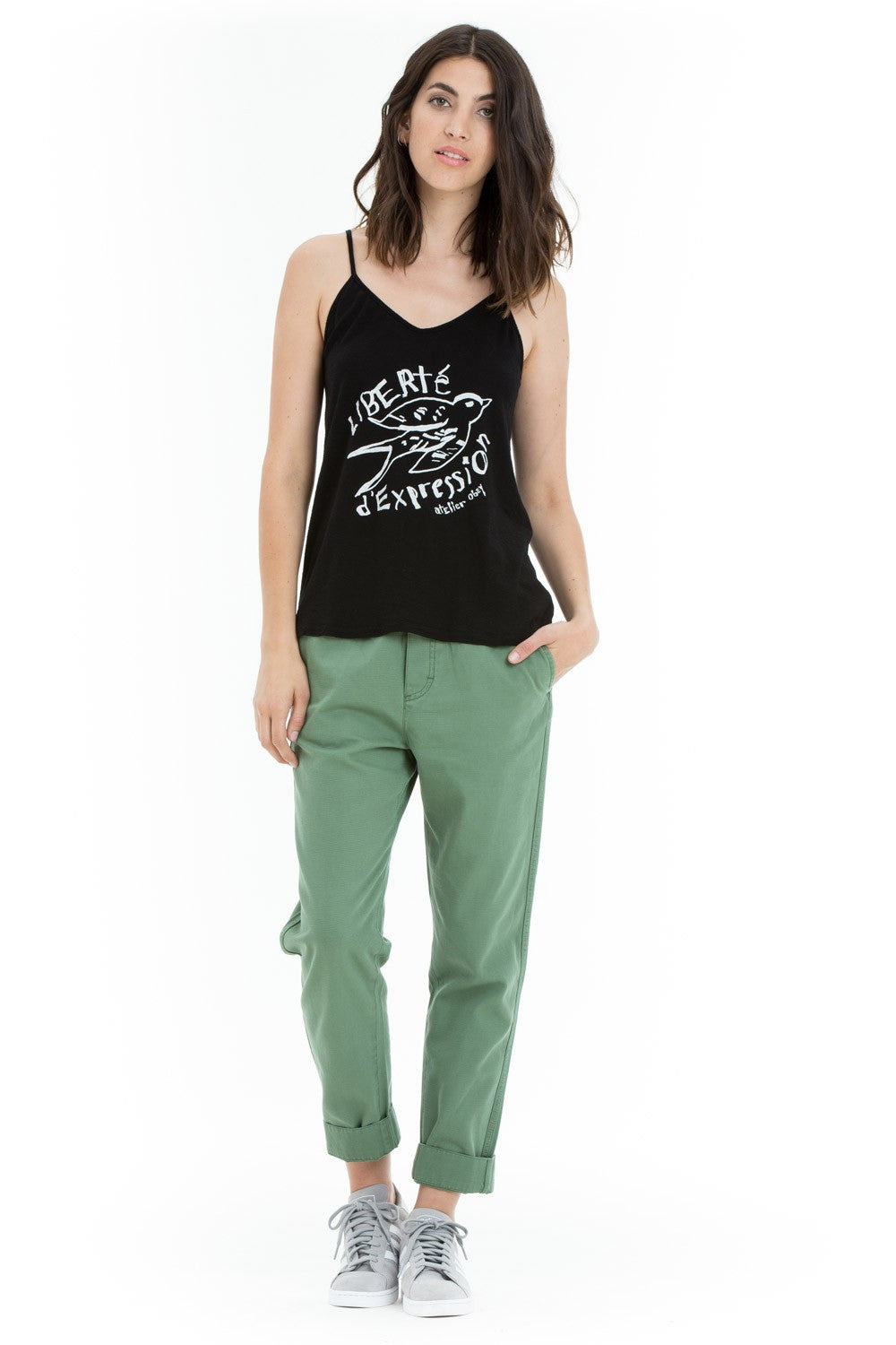 V-neck tank top with hand-drawn "Liberte d'Expression" artwork on across chest. Open v-neck back with adjustable strap detailing.