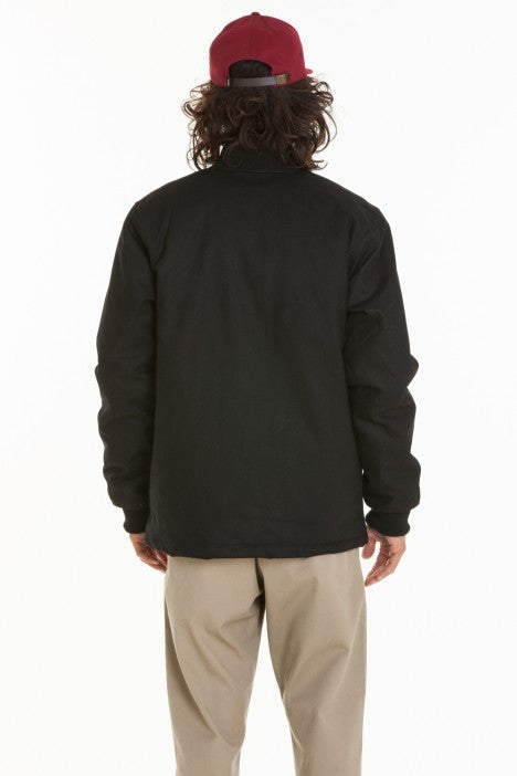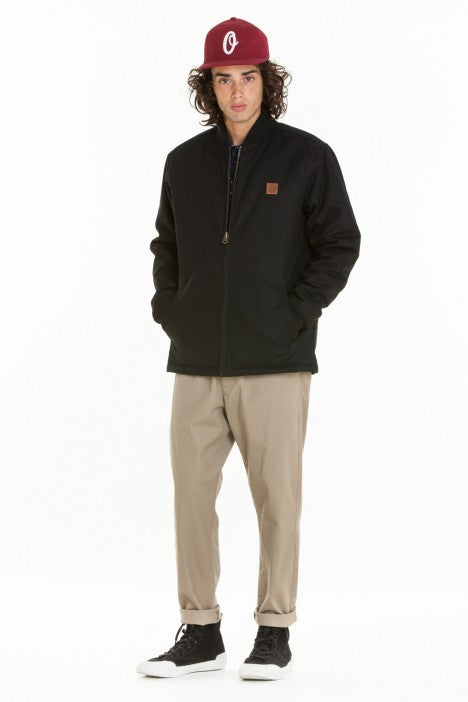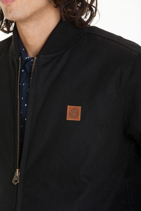 Black canvas bomber jacket with water resistant properties. Soft diamond quilted lining.