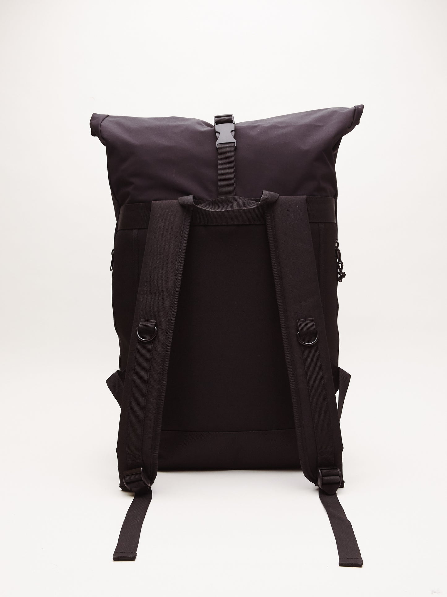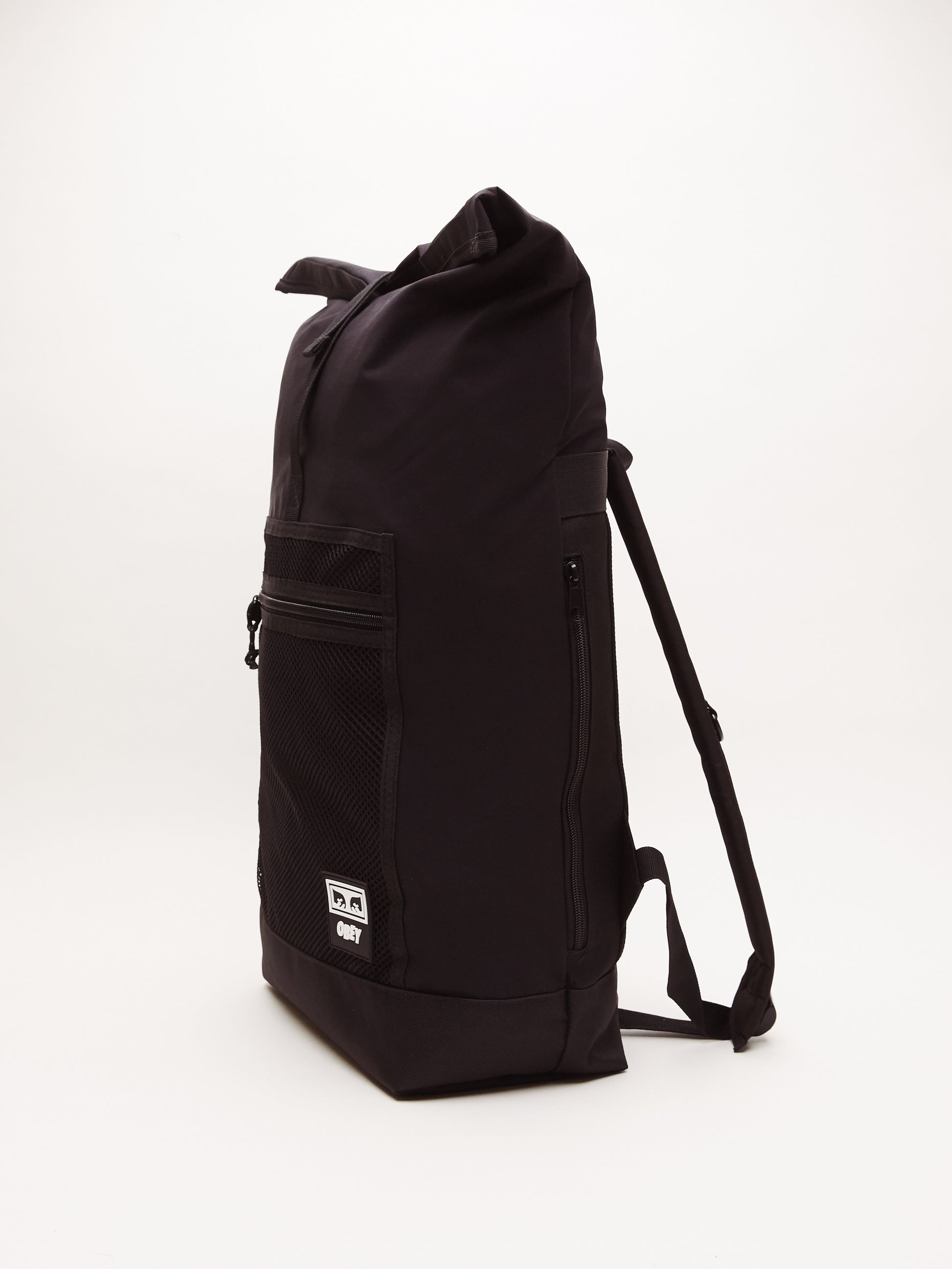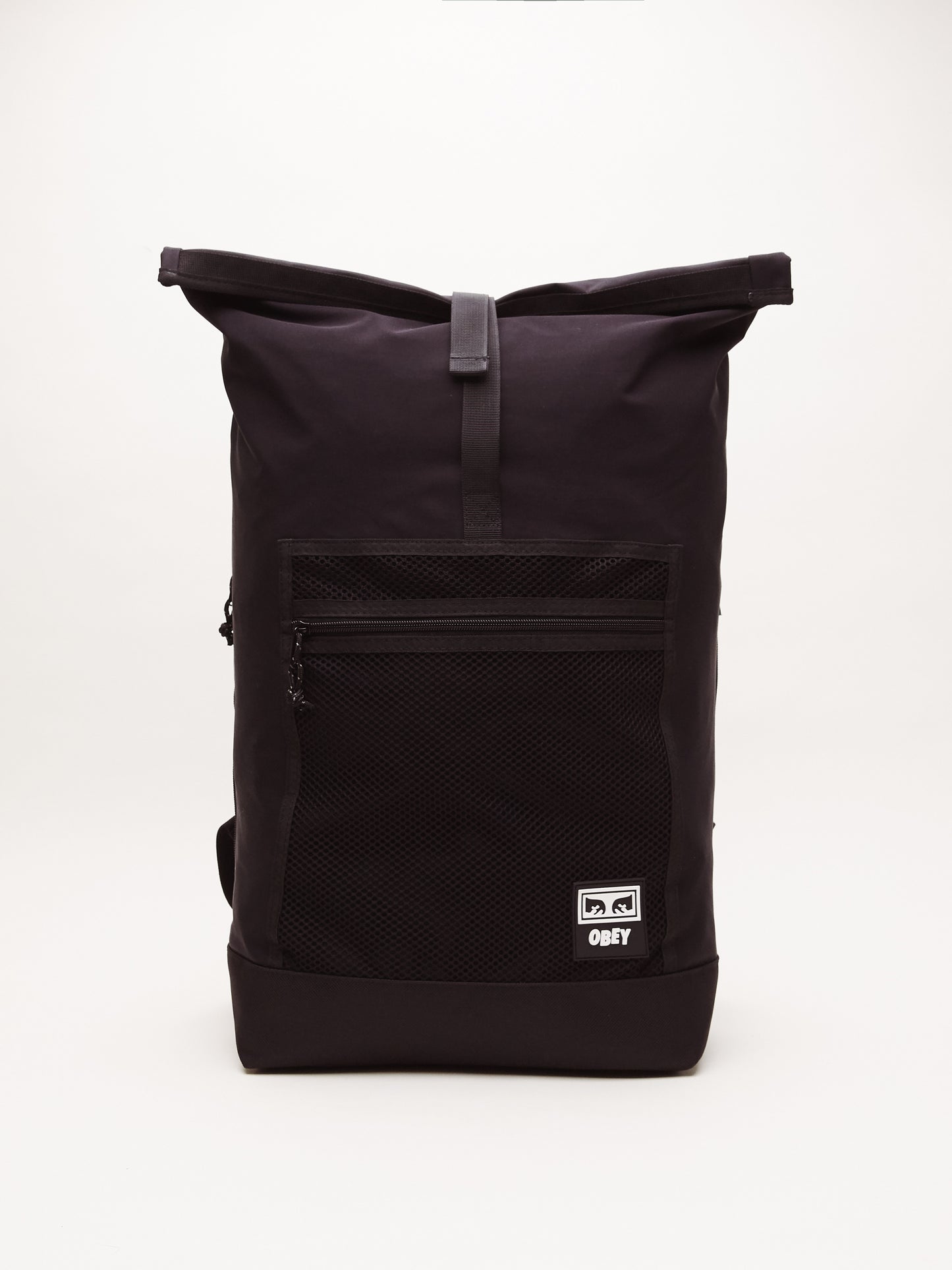 Black rolltop backpack with adjustable shoulder straps and front mesh pocket. Interior padded notebook sleeve with velcro closure and side zipper access.