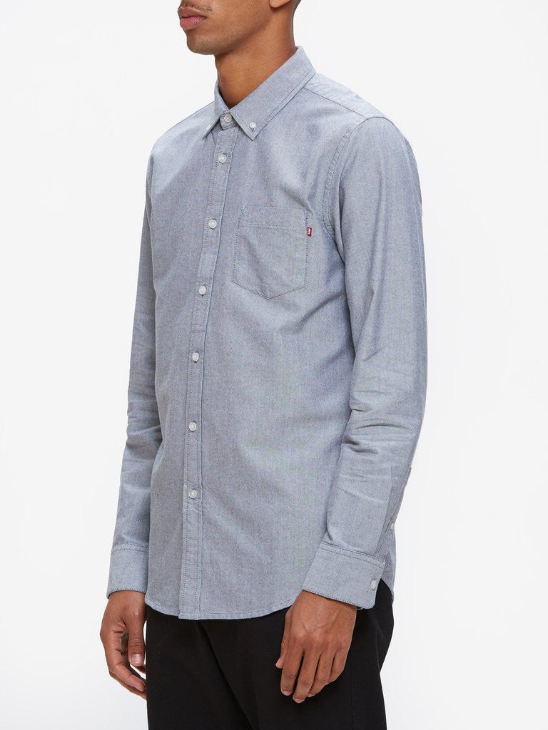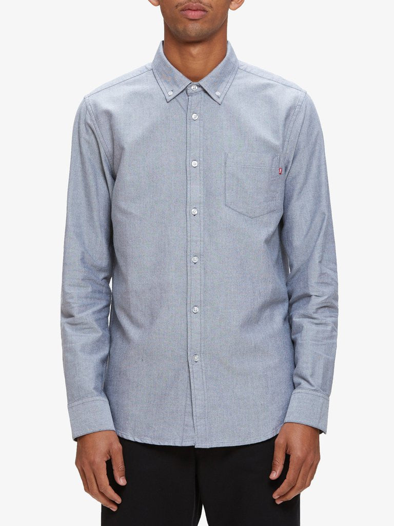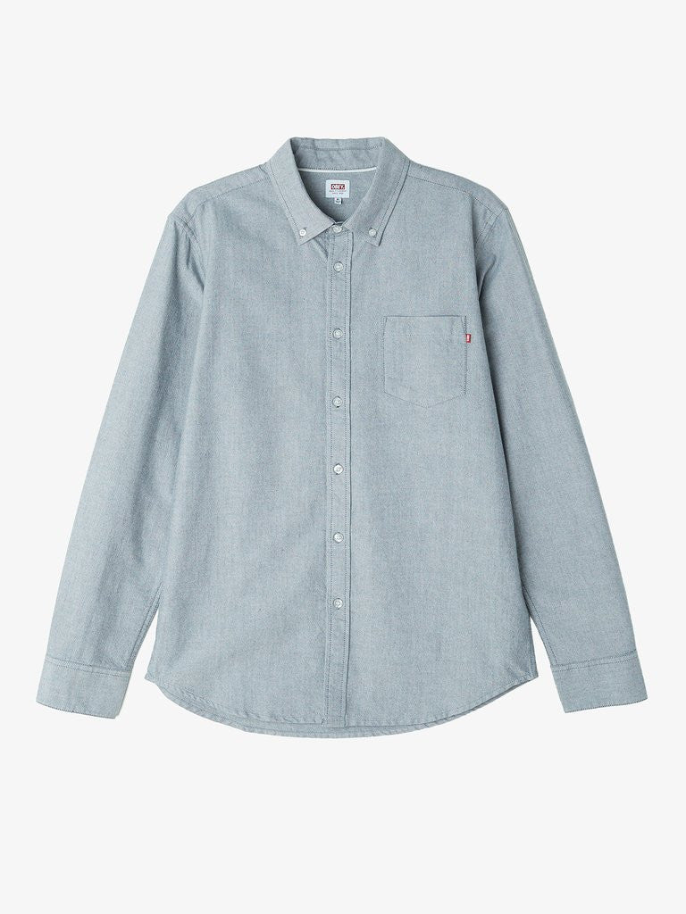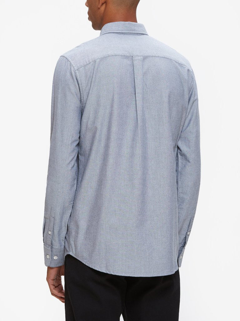 Slim fit long sleeve chambray oxford shirt. Features a button down collar, white pearl buttons, and a left chest buttoned pocket.