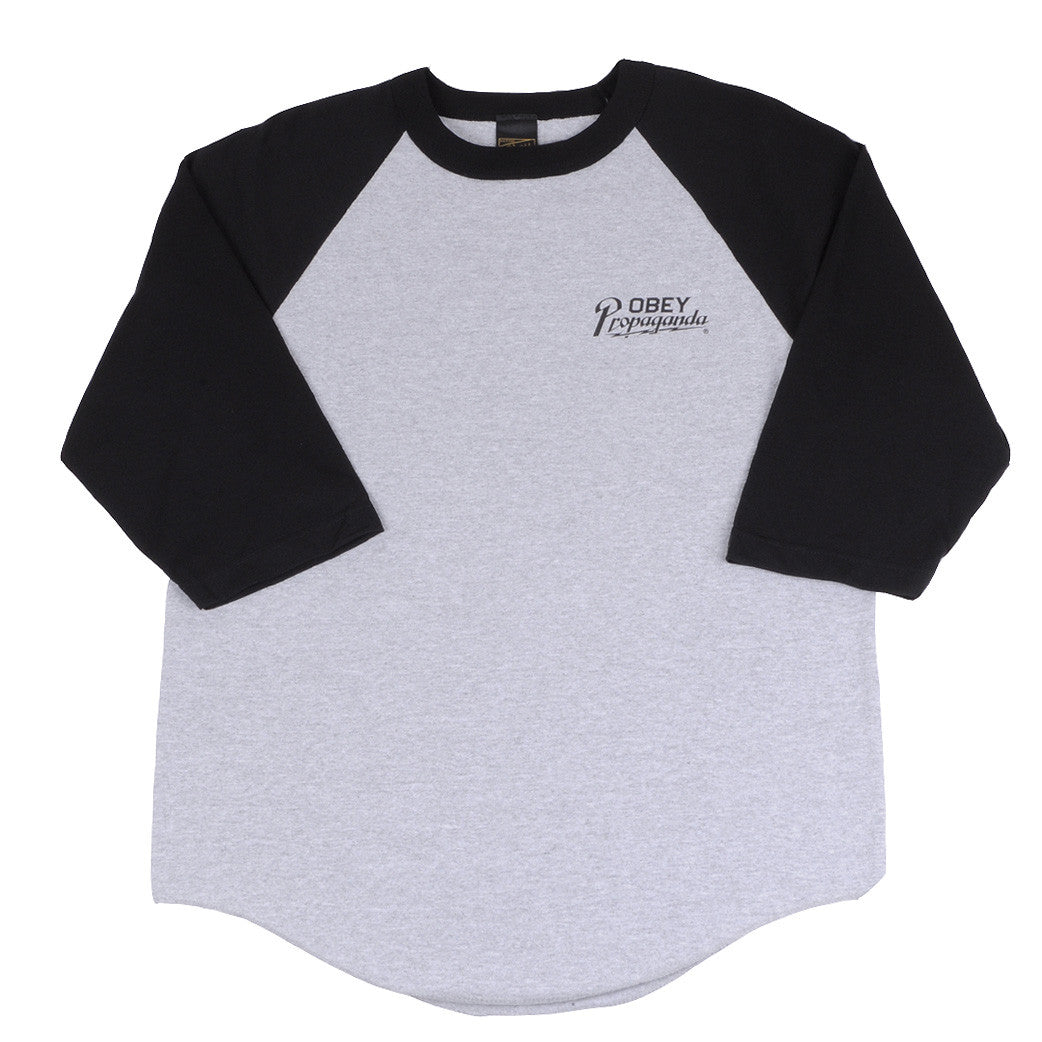 Regular fit baseball tee with constrasting 3/4 length black sleeves. Features Obey screenprint on left chest and contrast neck binding.