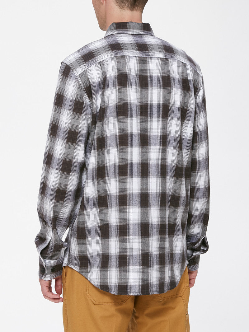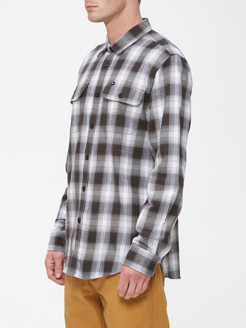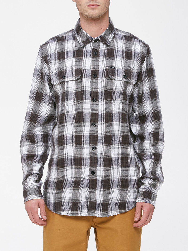 Regular fit shadow plaid flannel shirt. Features double chest pockets with buttoned flap closures. Custom OBEY label on left pocket and branded buttons.