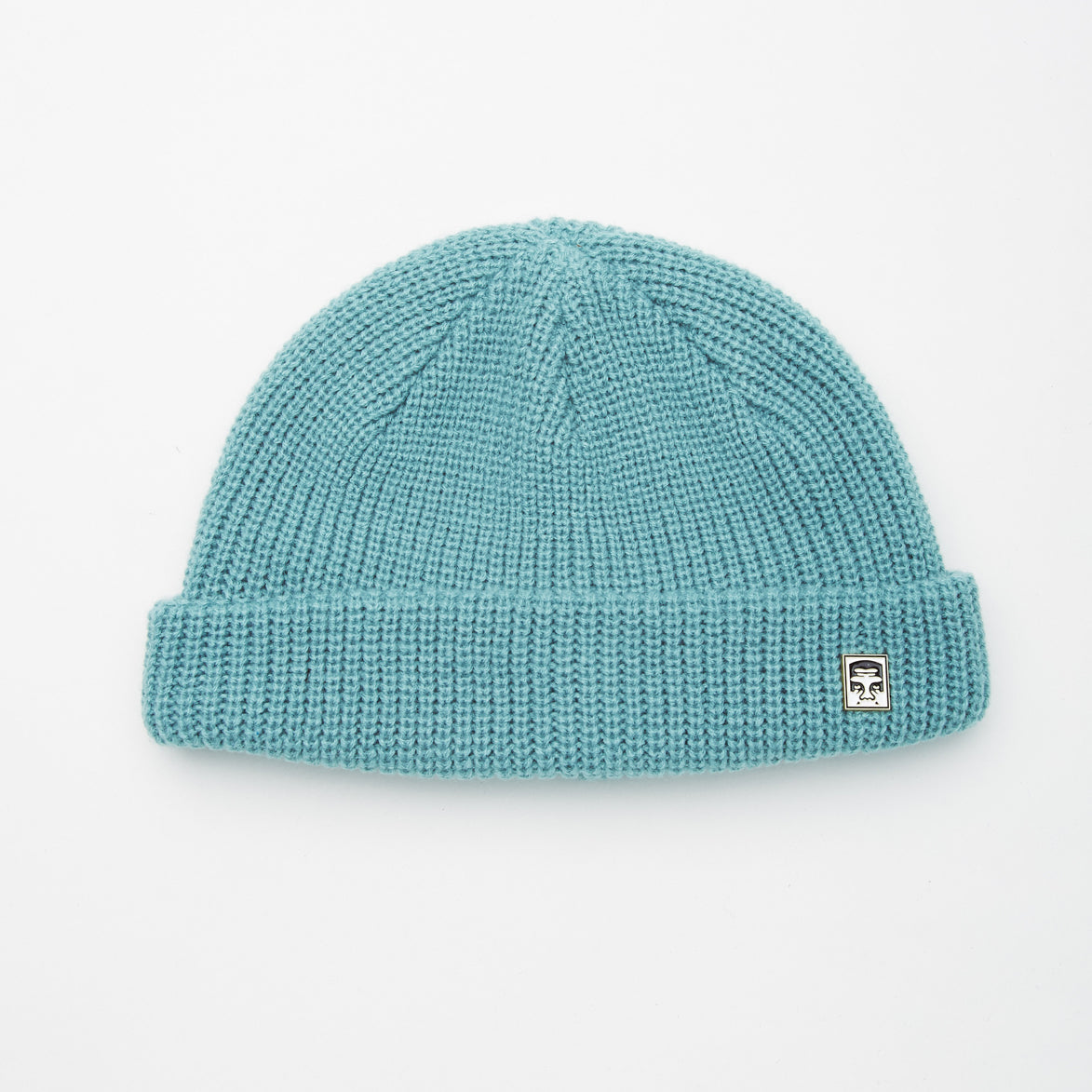 Oil blue micro knit beanie with rolled cuff and removable logo pin.