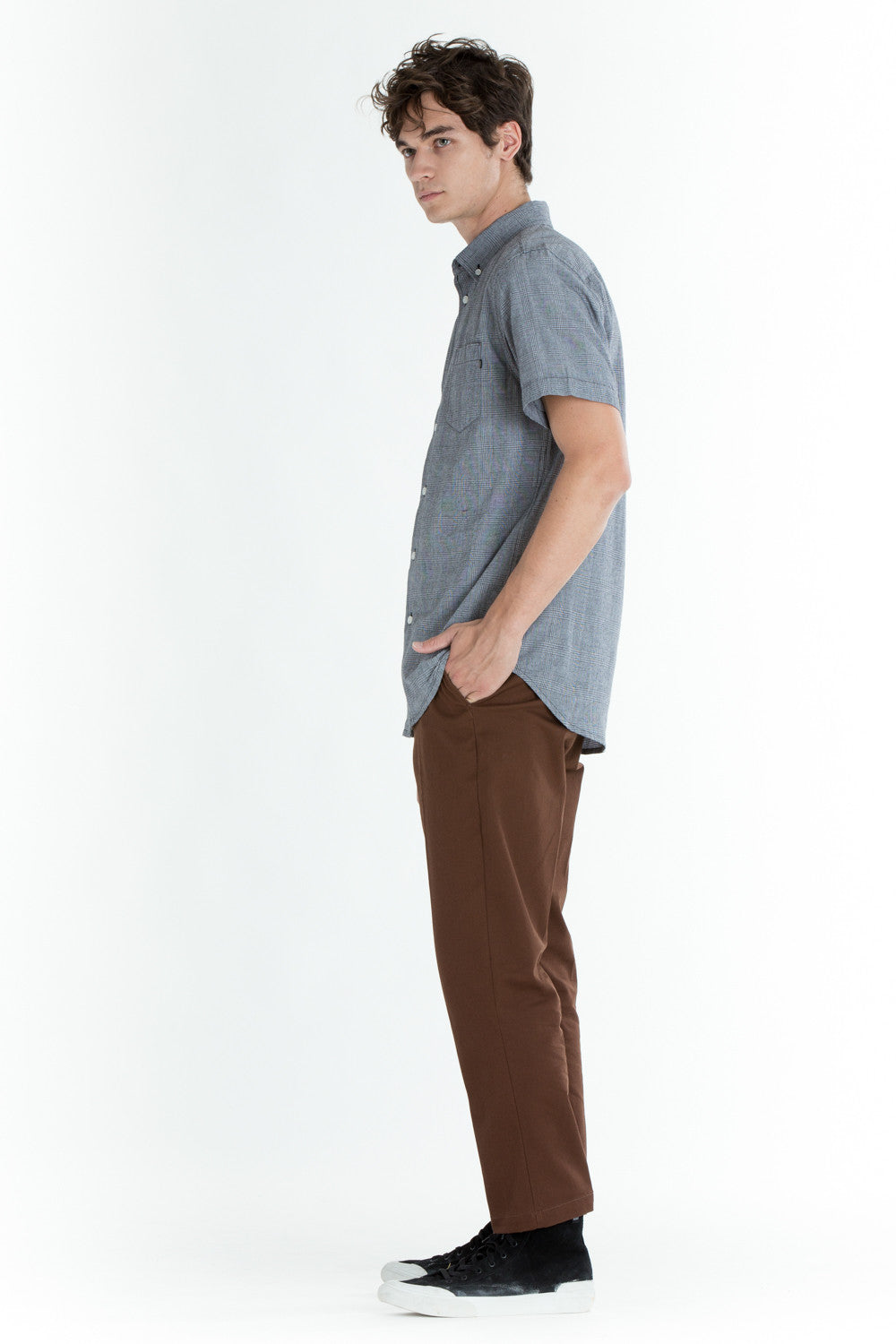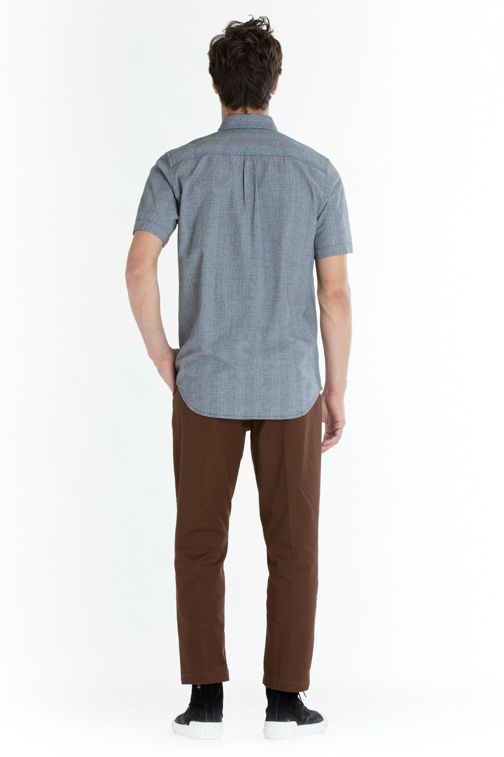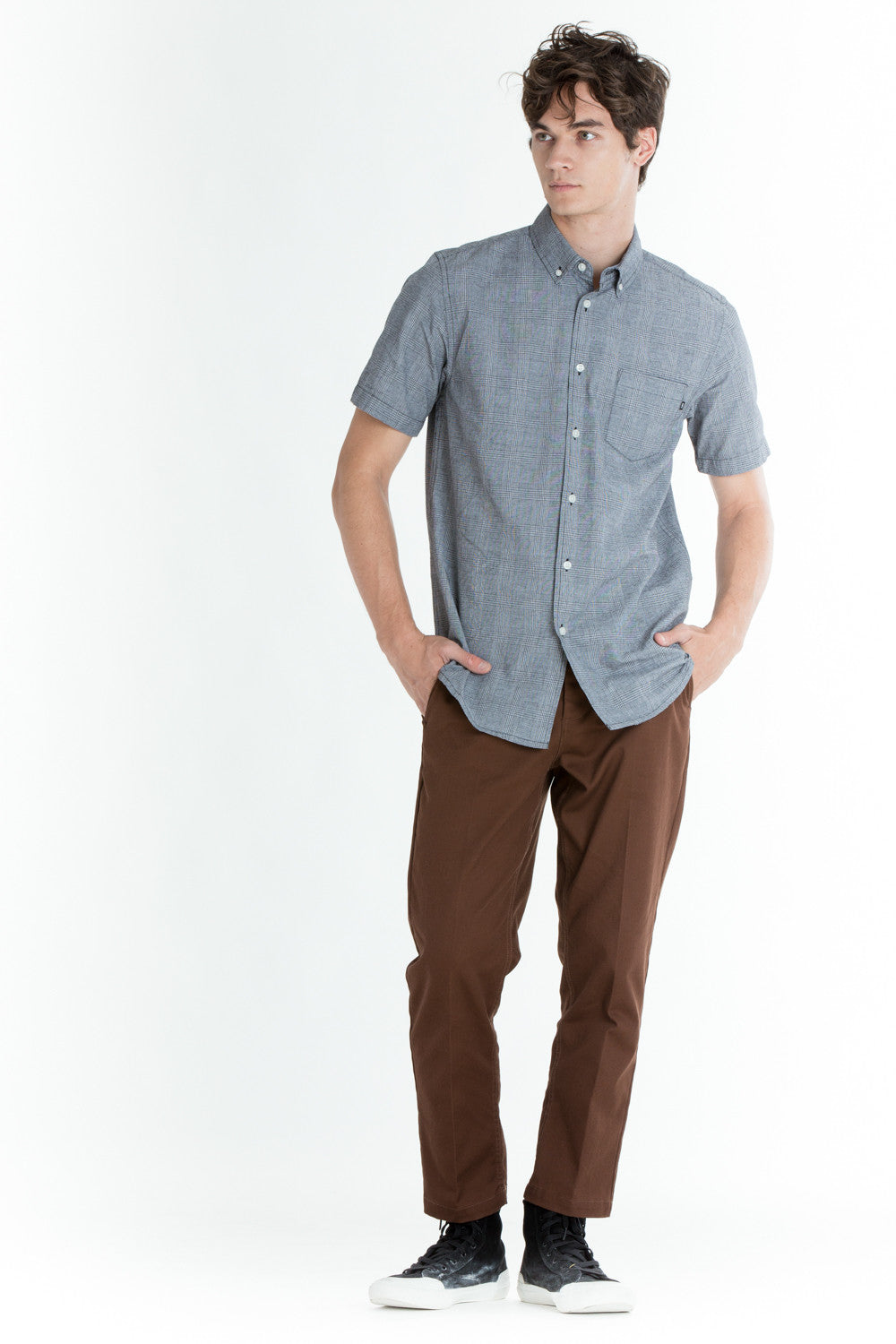 Slim fit button up short sleeve shirt in soft glen plaid fabric. Single pocket over left chest, button down collar, and grey buttons.