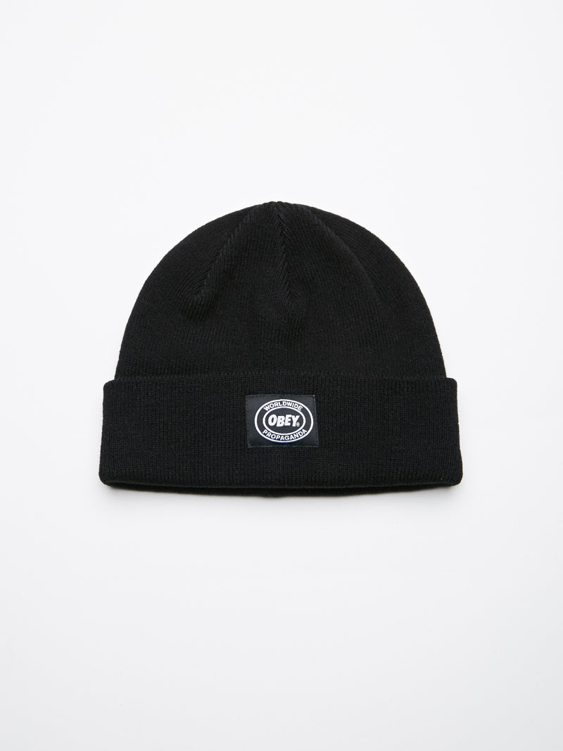 Shallow fine gauge knit beanie with rolled cuff and Obey woven patch.