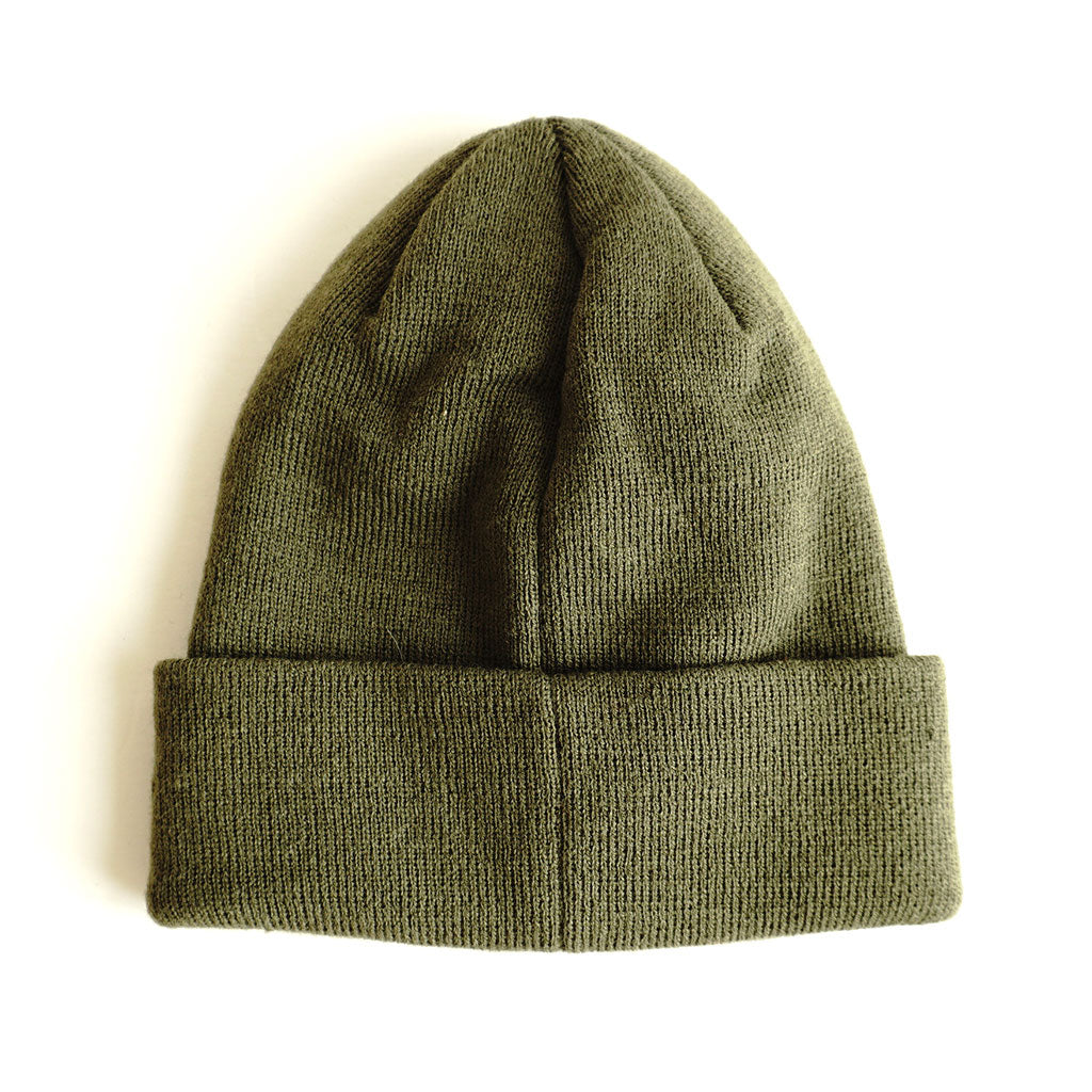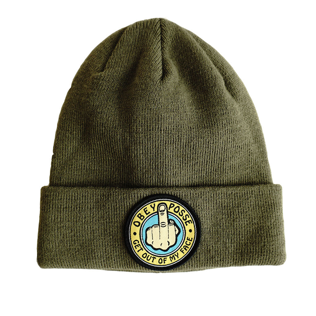 Get out of my face...the Obey way. Fine knit beanie in army with rolled cuff and custom Obey patch.