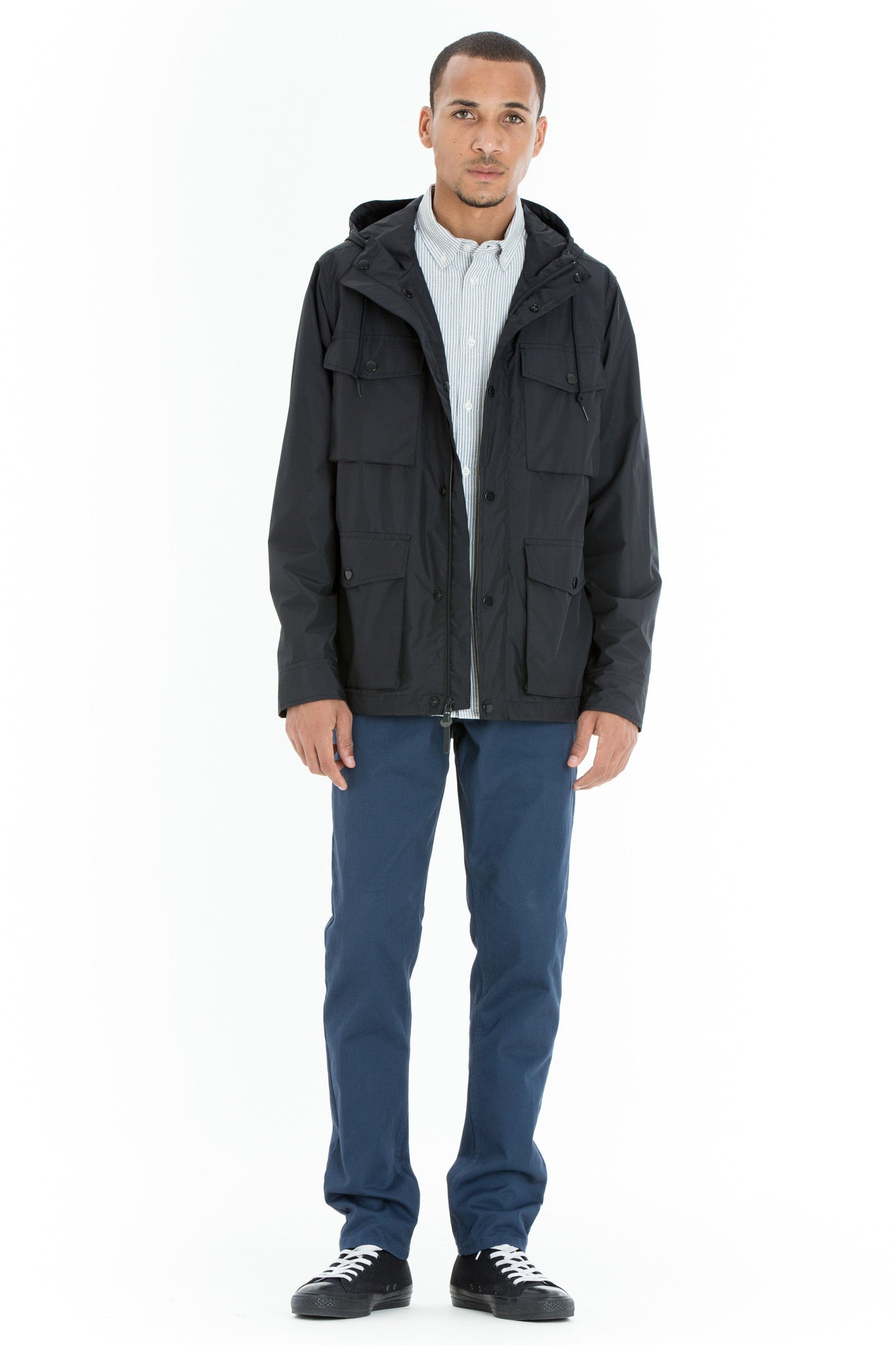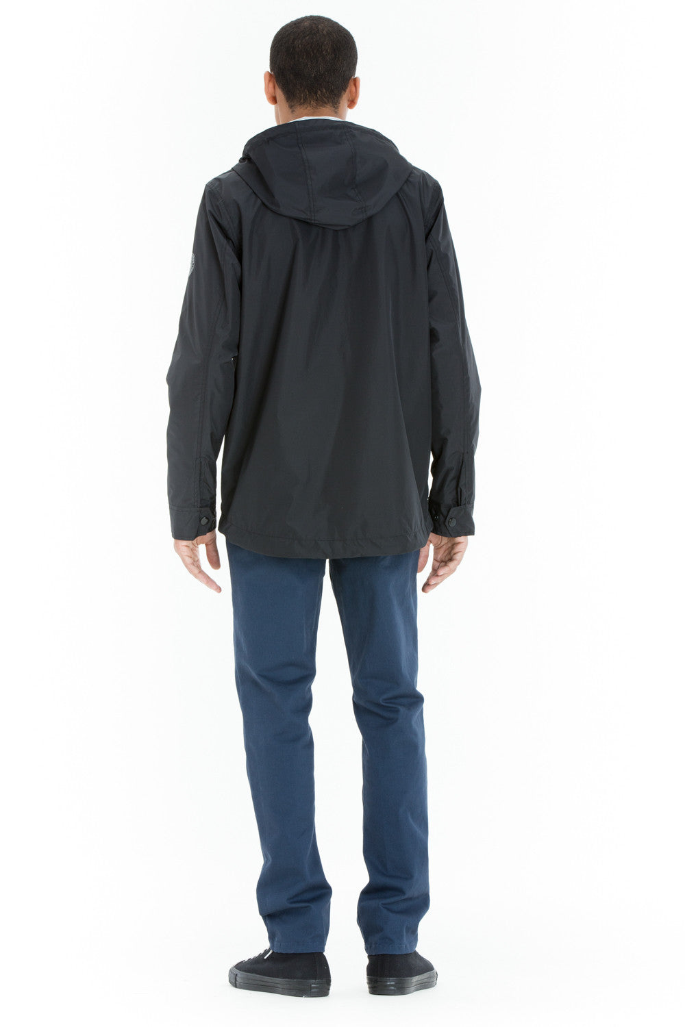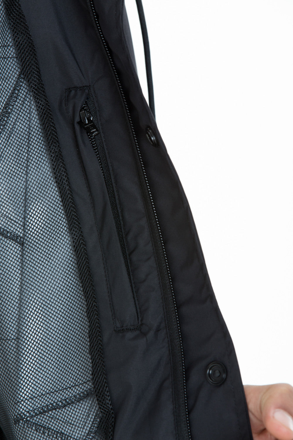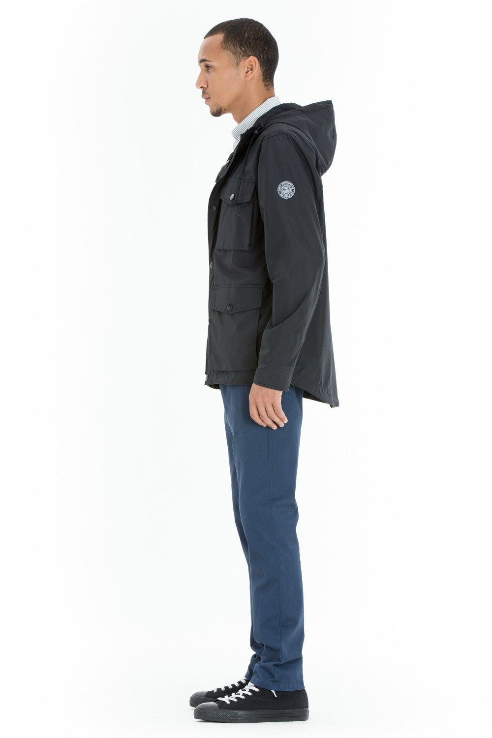 Regular fit hooded mid length parka jacket. Durable body with heavy coating on back for water resistancy. Features four patch pockets and drawcords at neck and bottom of waist. 3M reflective Obey star face logo on left arm.