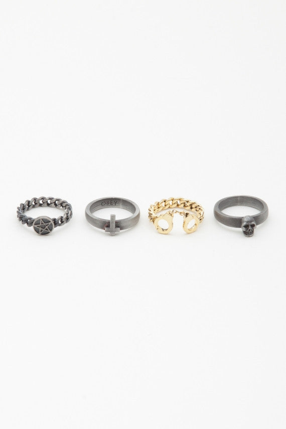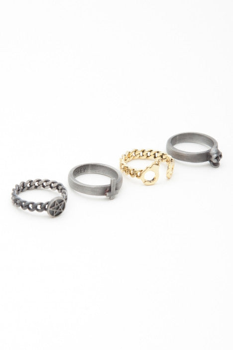 Set of 4 stackable rings with four different charms: Skull, handcuffs, cross and pentagram.