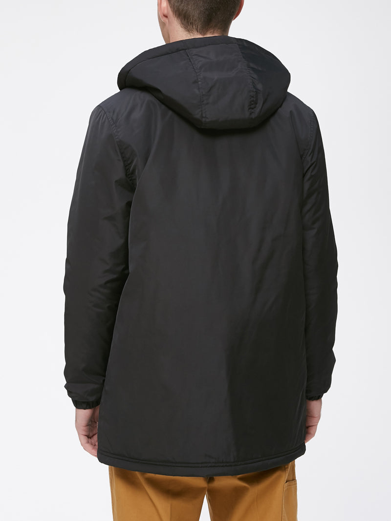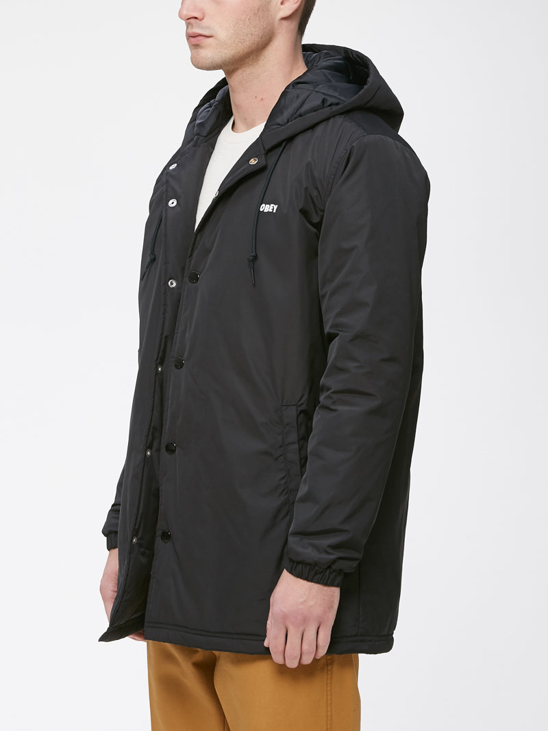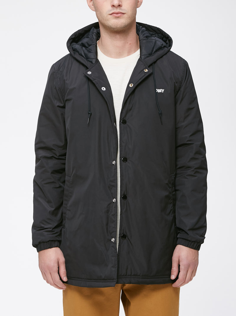 Regular fit stadium parka. Soft and insulated hooded jacket with interior diamond quilting at hood, body, and sleeves. High gloss OBEY logo snap closures and branded screen print at chest.