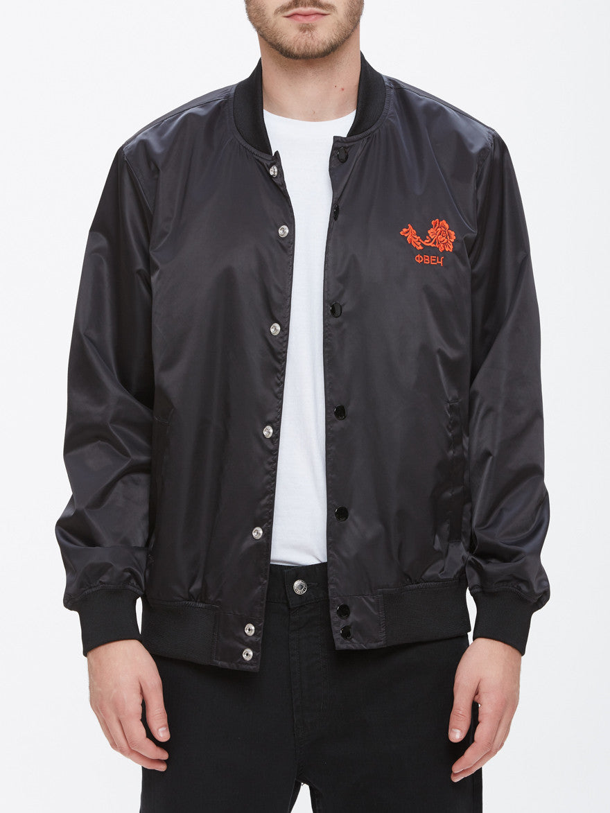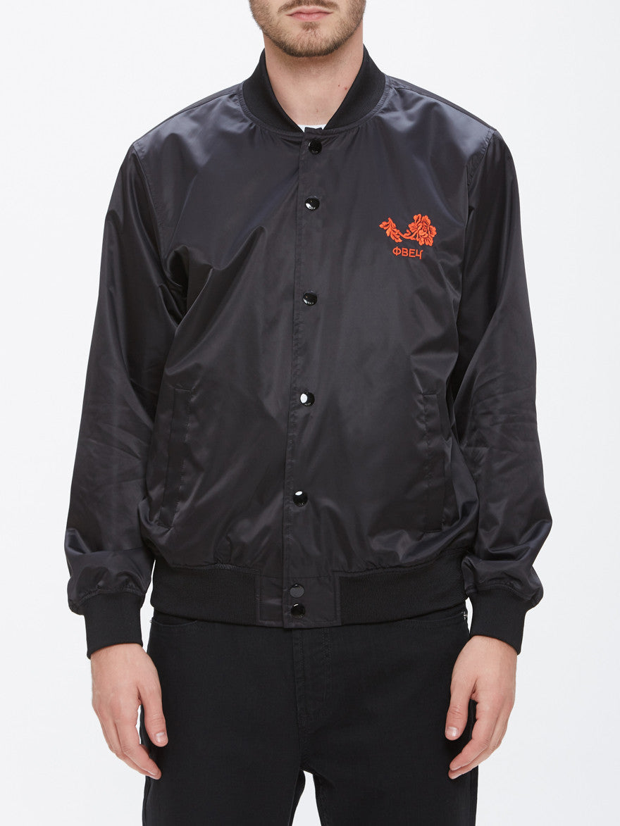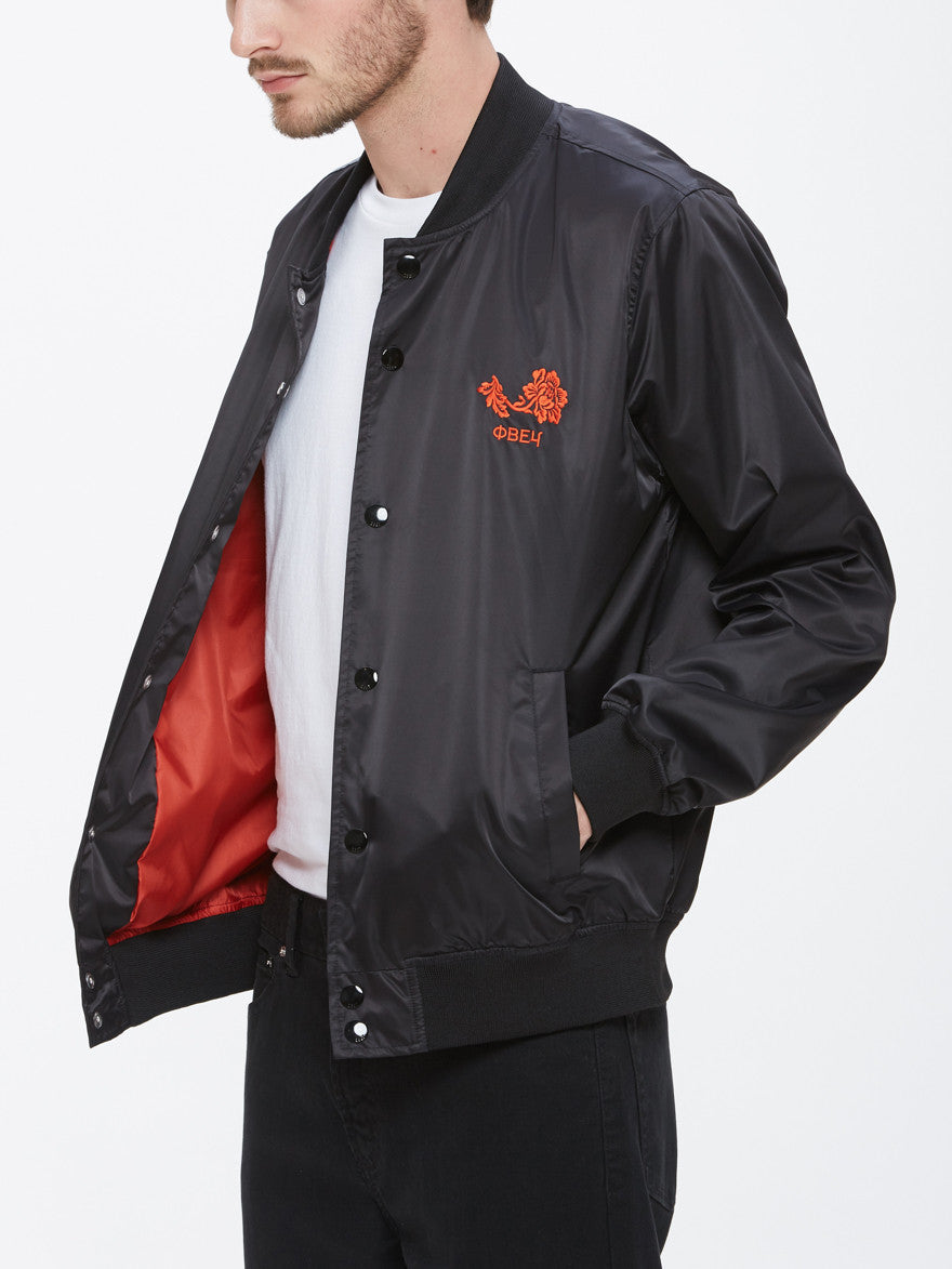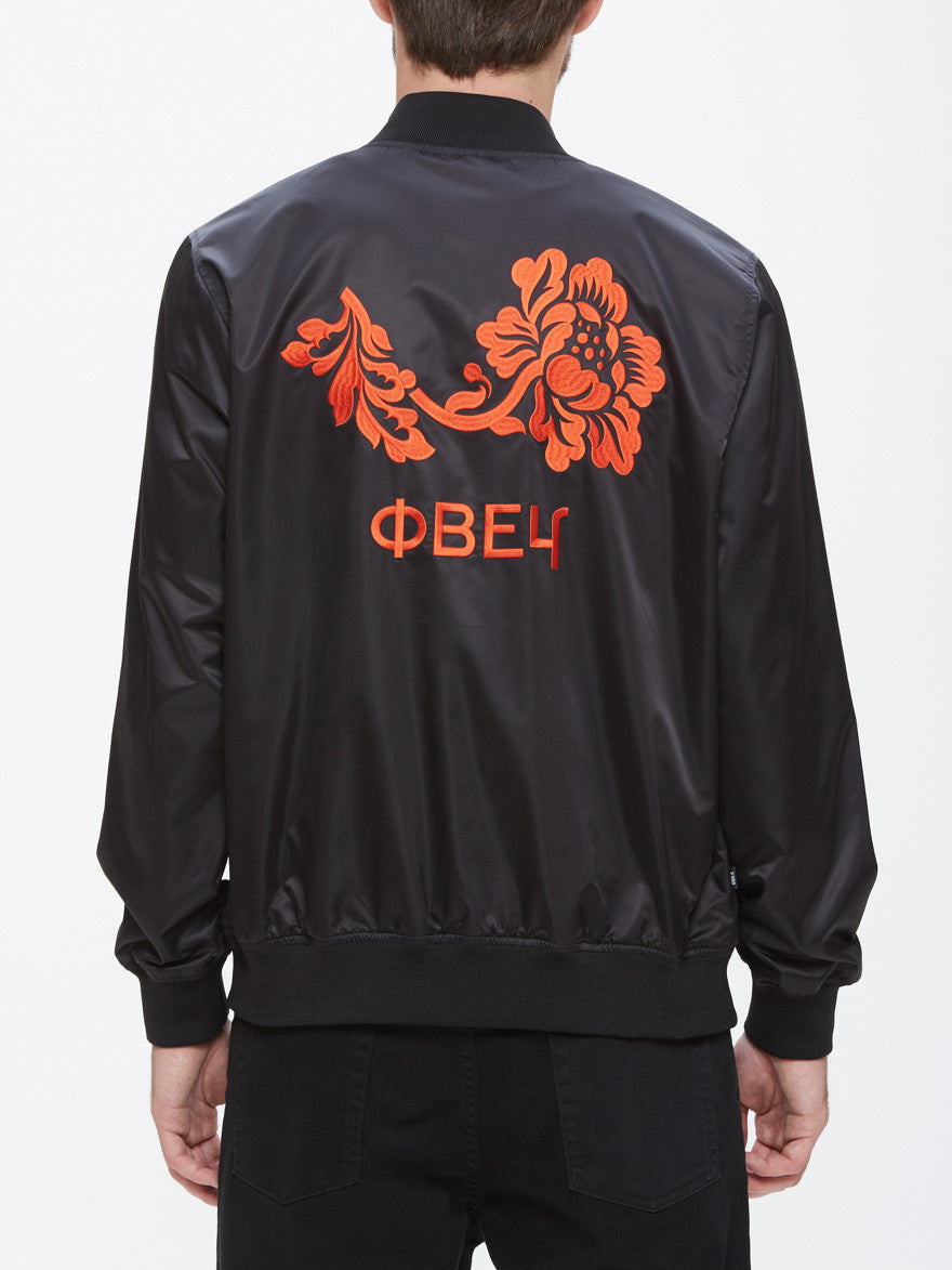 Regular fit satin bomber jacket with logo snap closures. Red contrast lining at interior body and pocket entry. Soft rib detailing at collar, cuffs, and waistband. Obey custom embroidery at chest and across the back.