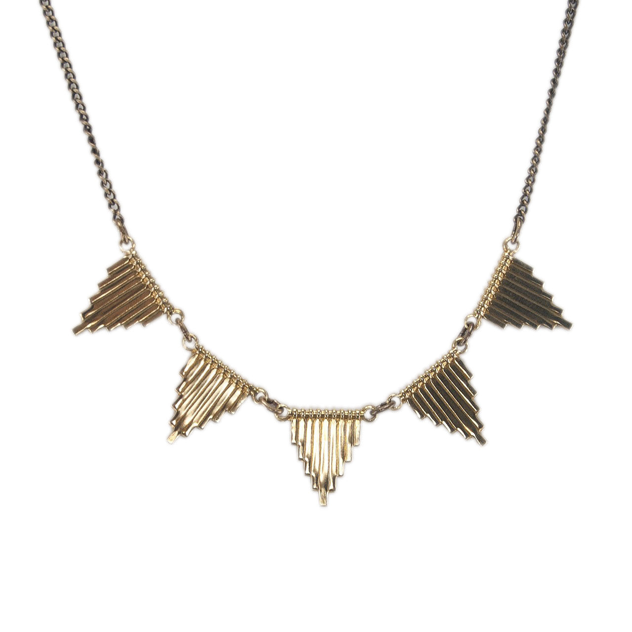Five art deco inspired triangles on 18" aged brass chain. Each triangles measures approximately 1/2" from top to bottom.